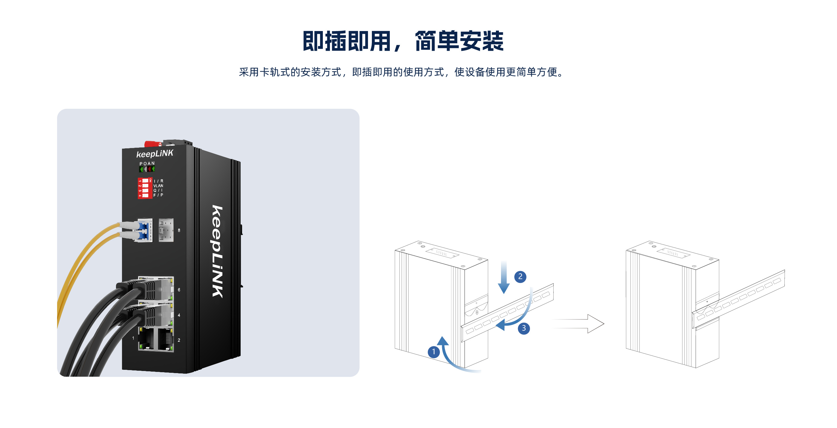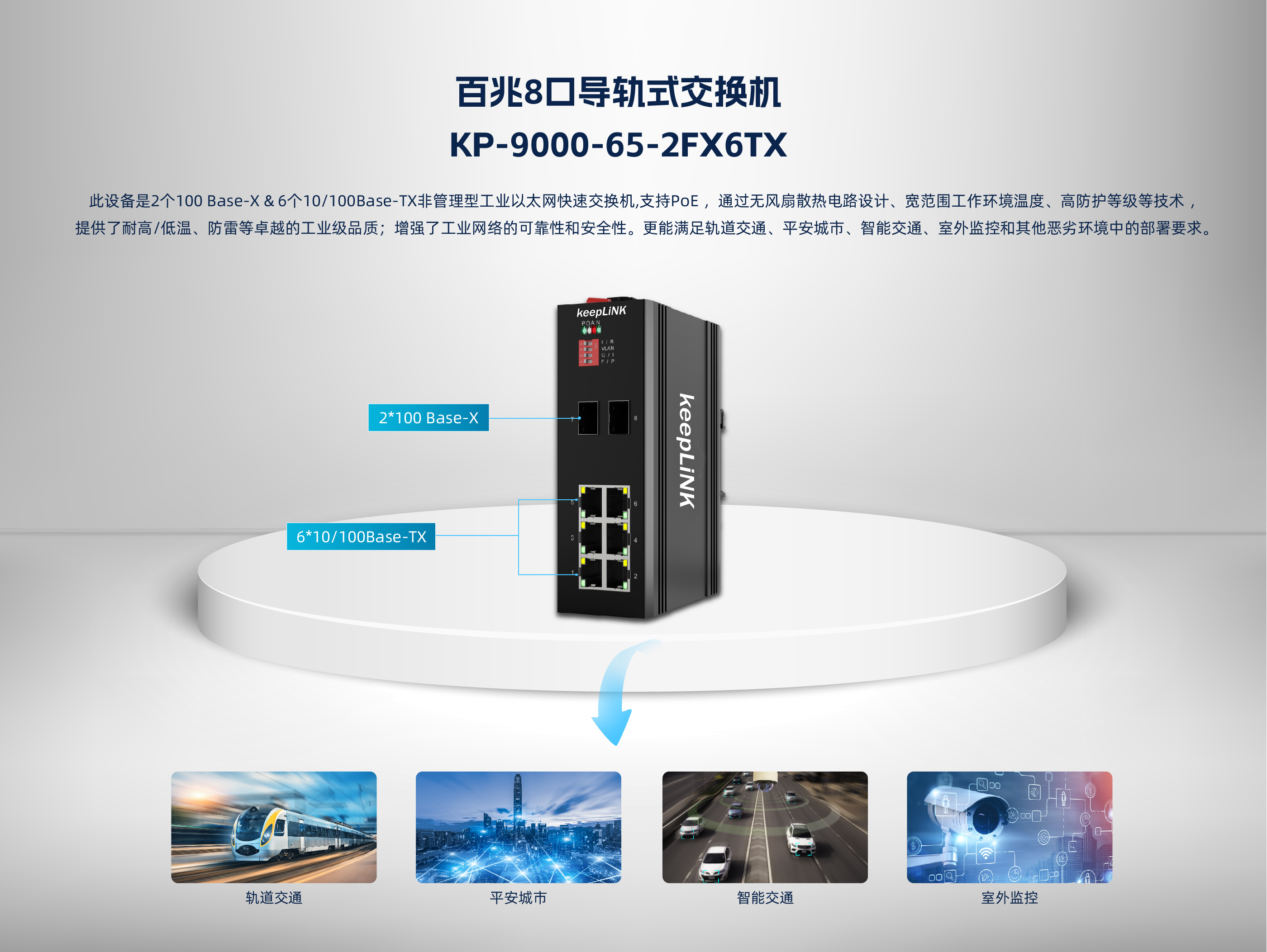 KP-9000-65-2FX6TP | 2个百兆SFP光接口(光口可选SC,ST,FC), 6个10/100M自适应电口,支持PoE&PoE+ |