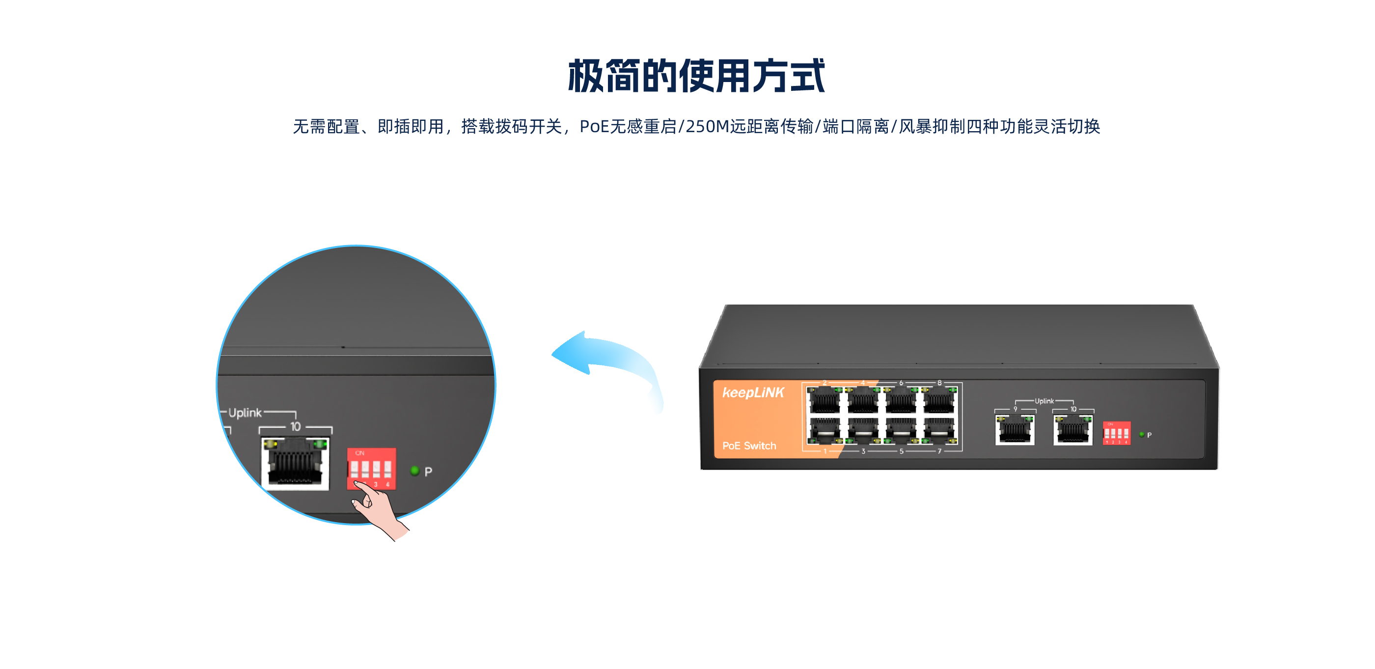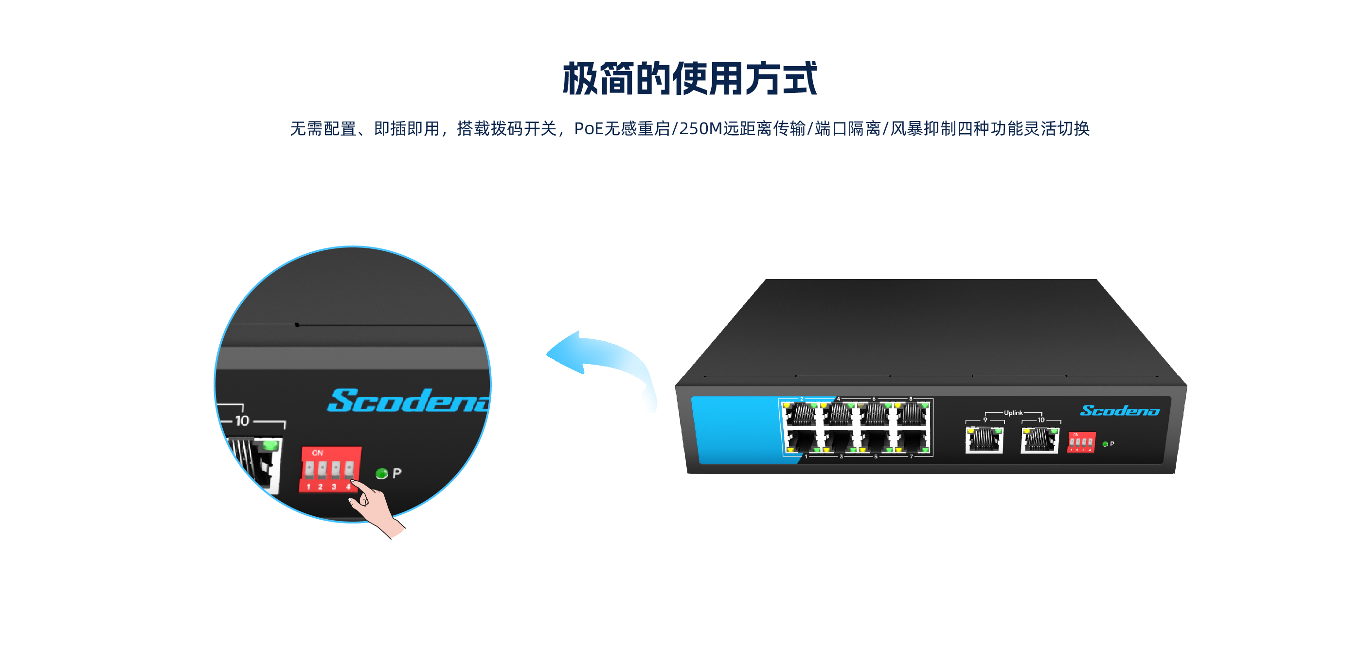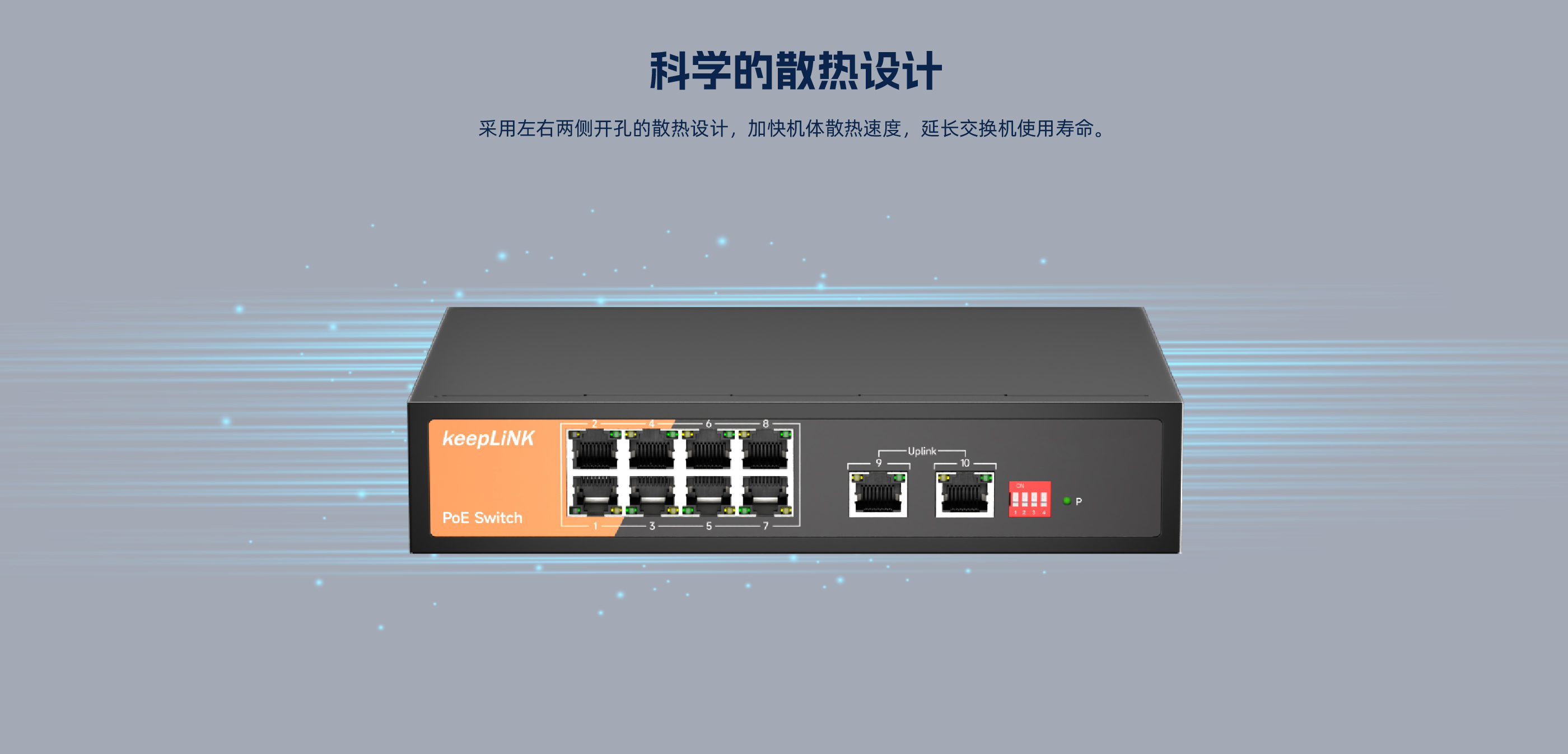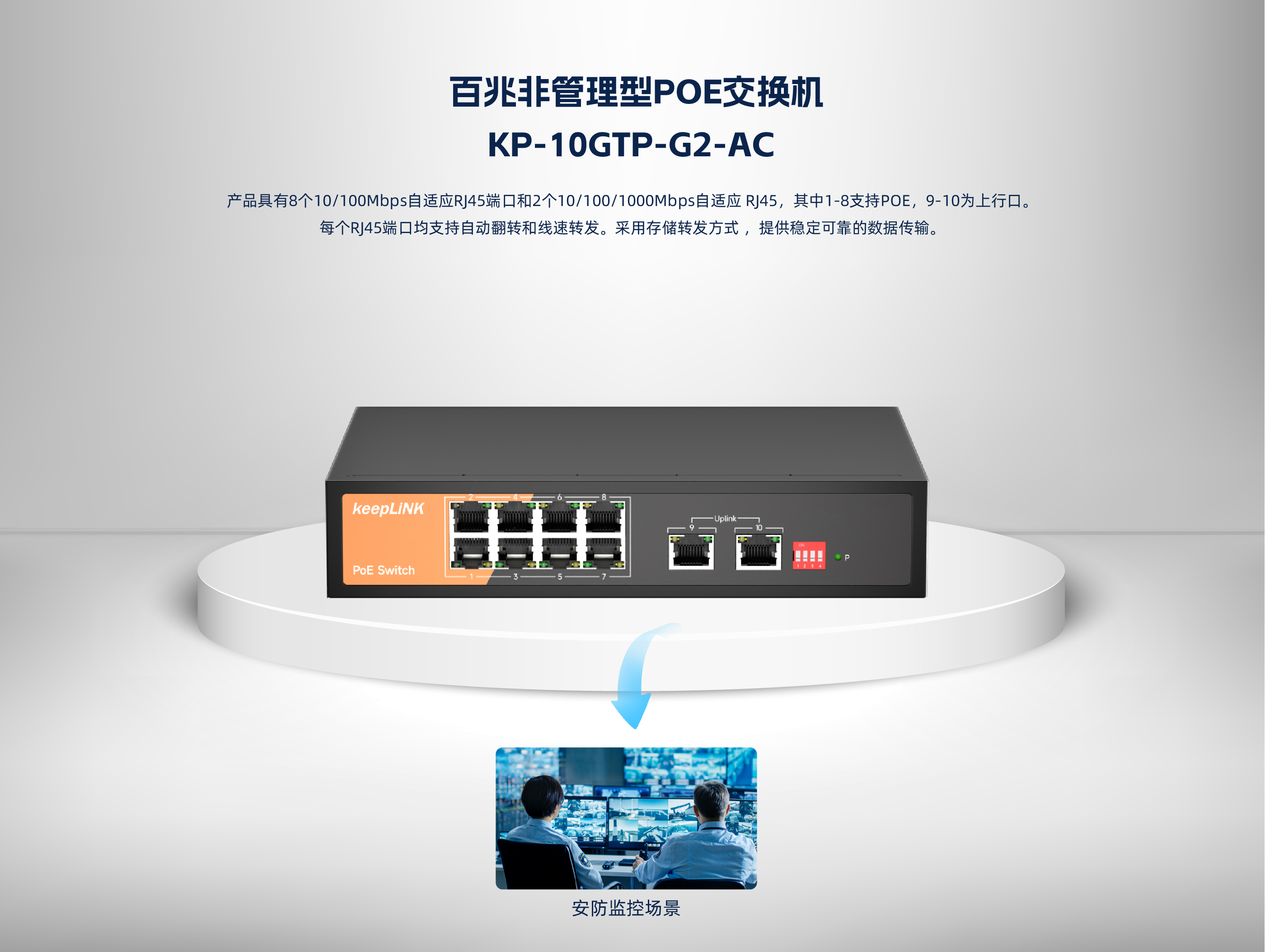 S200-10GTP-G2-AC系列非管理型PoE交换机 ,具有8个10/100Mbps自适应 RJ45 端口和2个10/100/1000Mbps自适应 RJ45 ,其中1-8支持POE ,9-10为上行 口。每个 RJ45 端口均支持自动翻转和线速转发。采用存储转发方式 ,提供稳定可靠 的数据传输。
