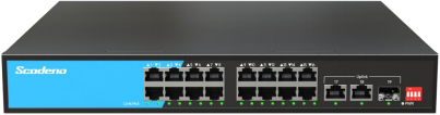 S200-19GTP-SG2-AC系列非管理型PoE交换机 ,具有16个10/100Mbps自适 应 RJ45 端口、2个10/100/1000Mbps自适应 RJ45端口和1个千兆光口 ,其中1-16 支持POE , 17-19为上行口。每个 RJ45 端口均支持自动翻转和线速转发功能。采用 存储转发方式 ,提供稳定可靠的数据传输。