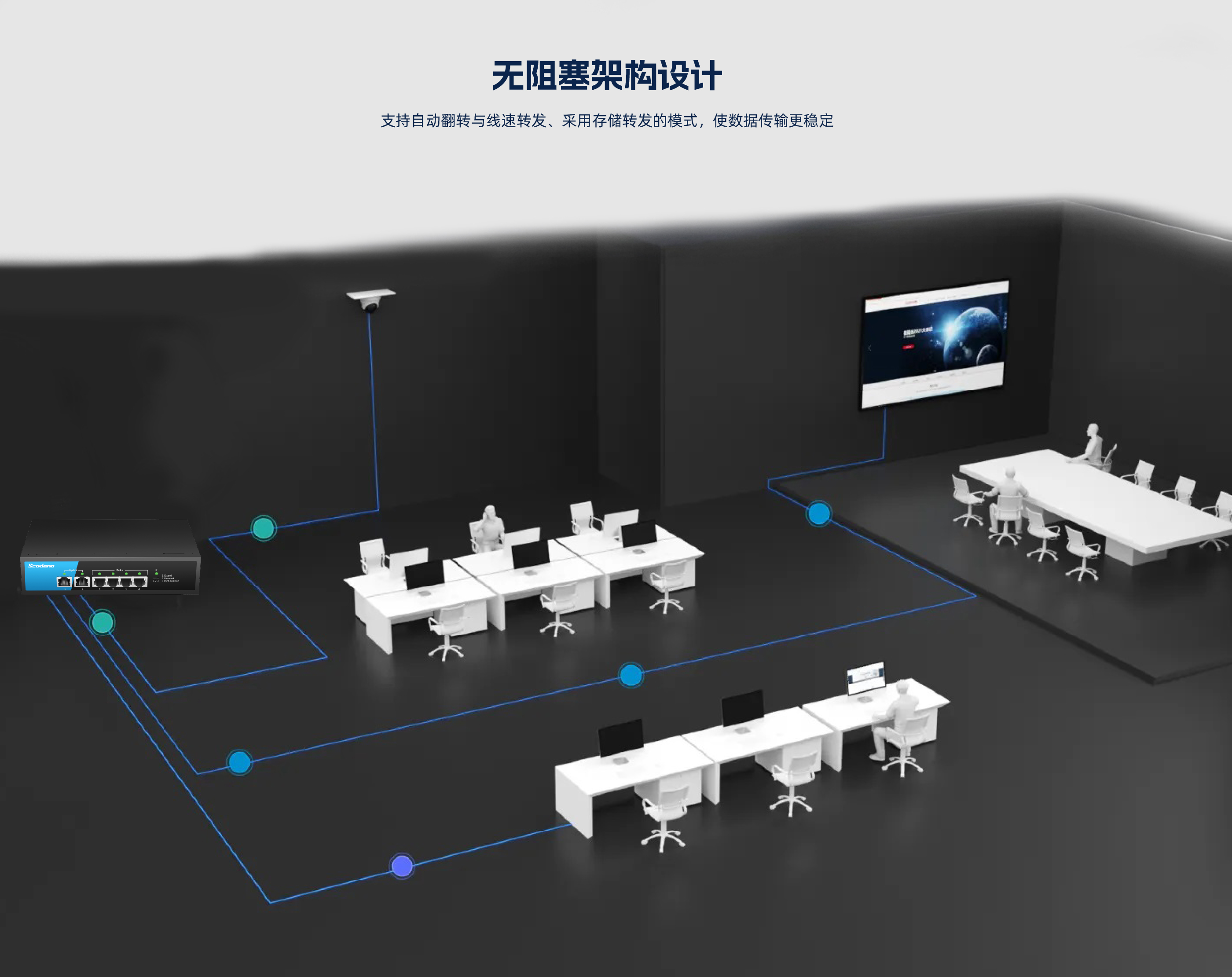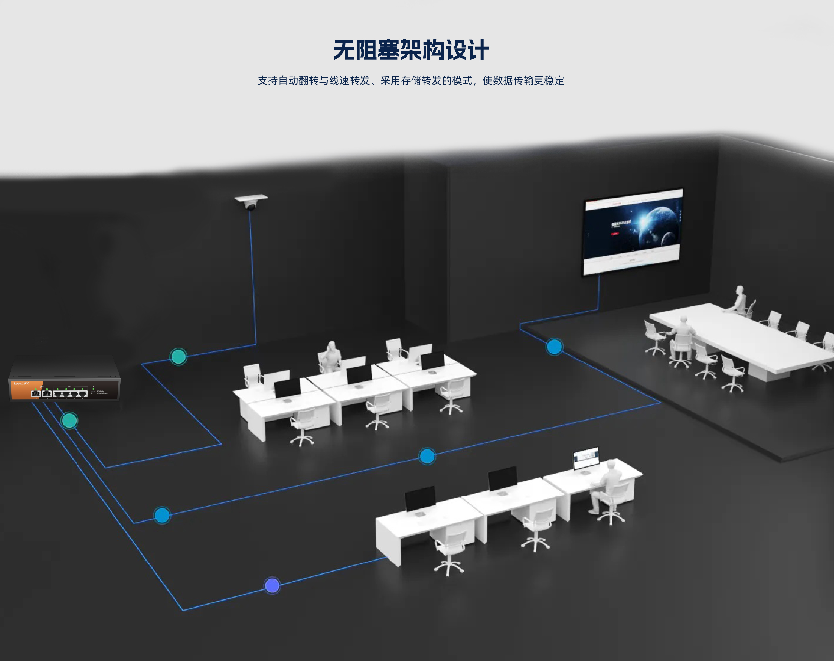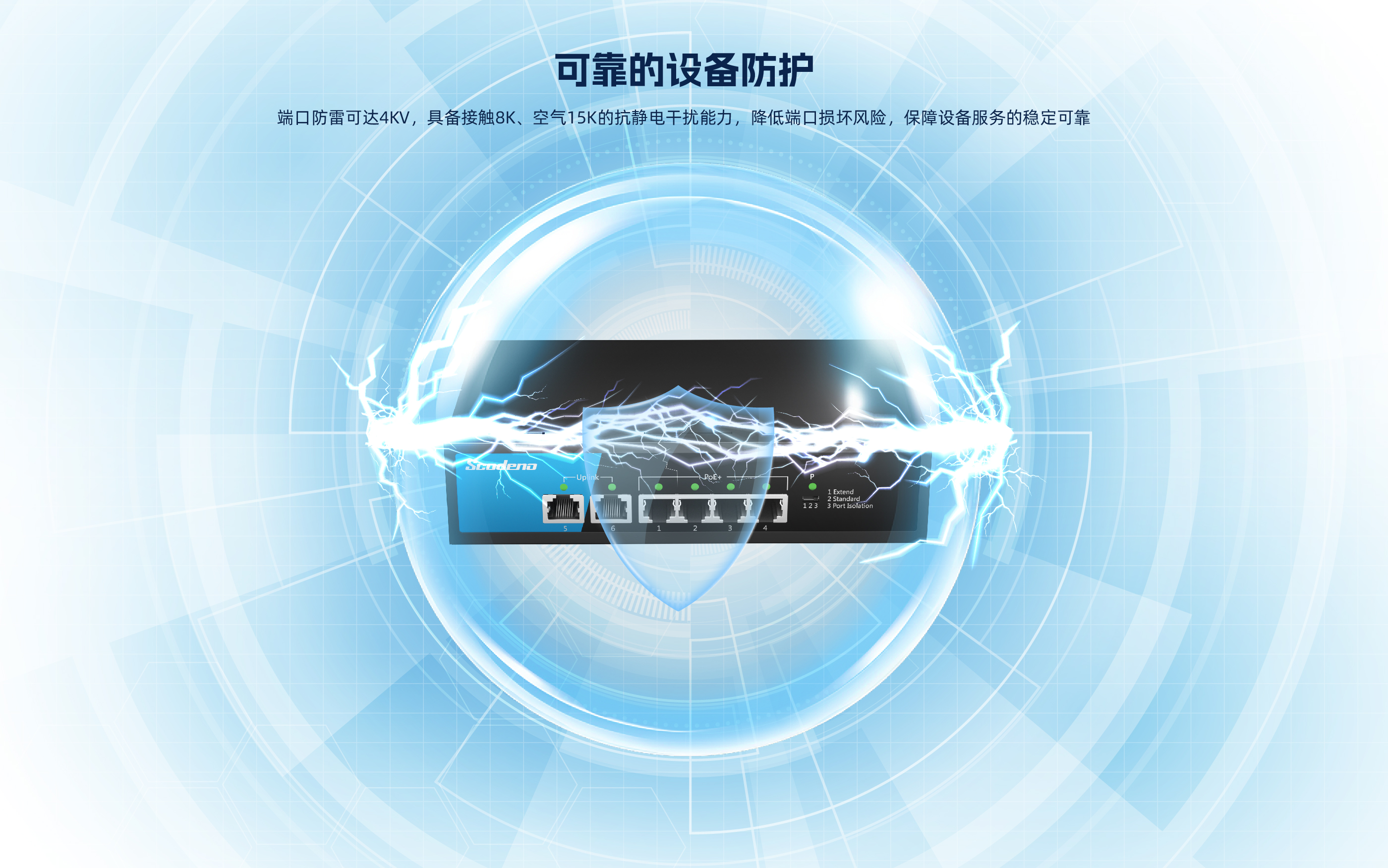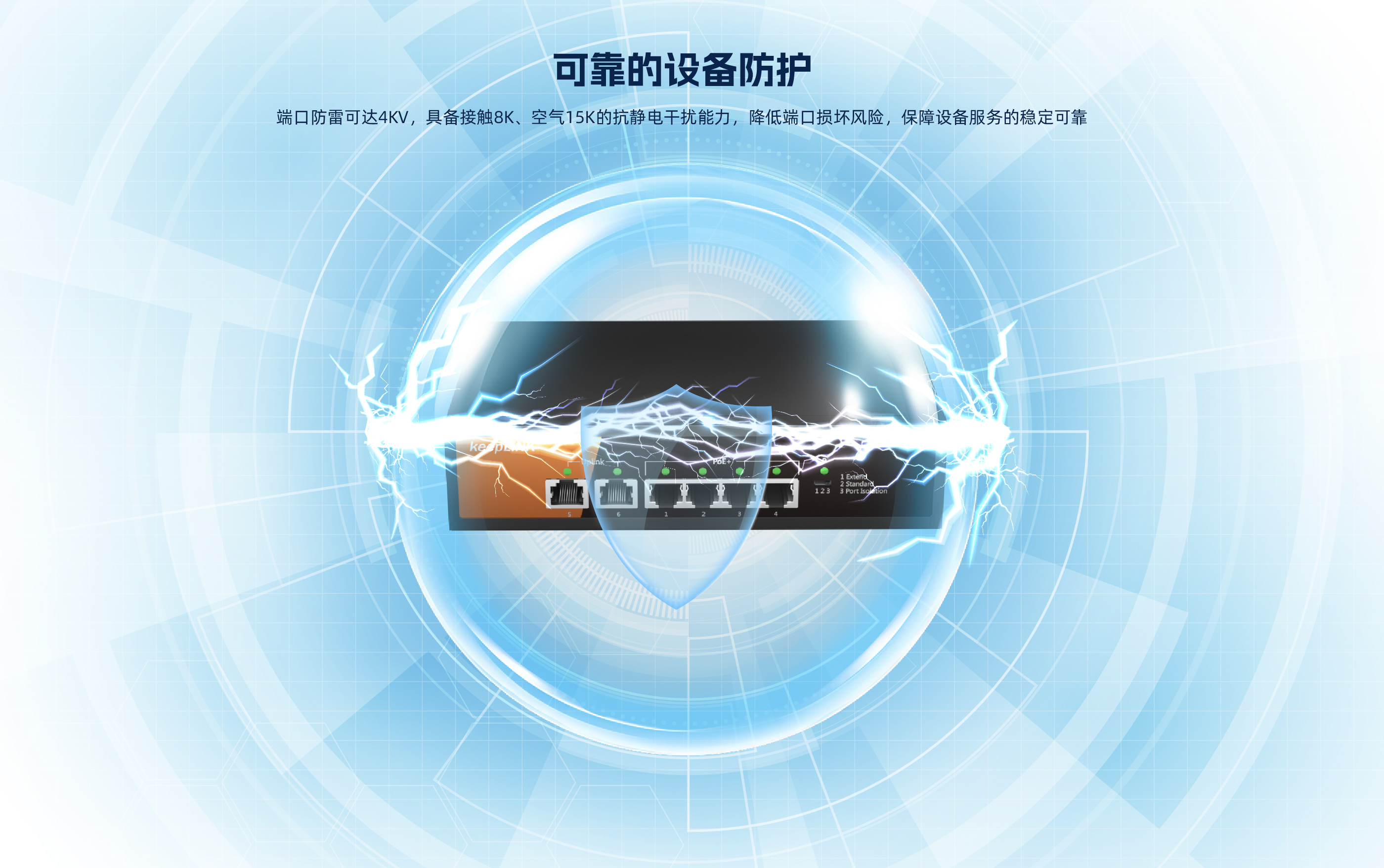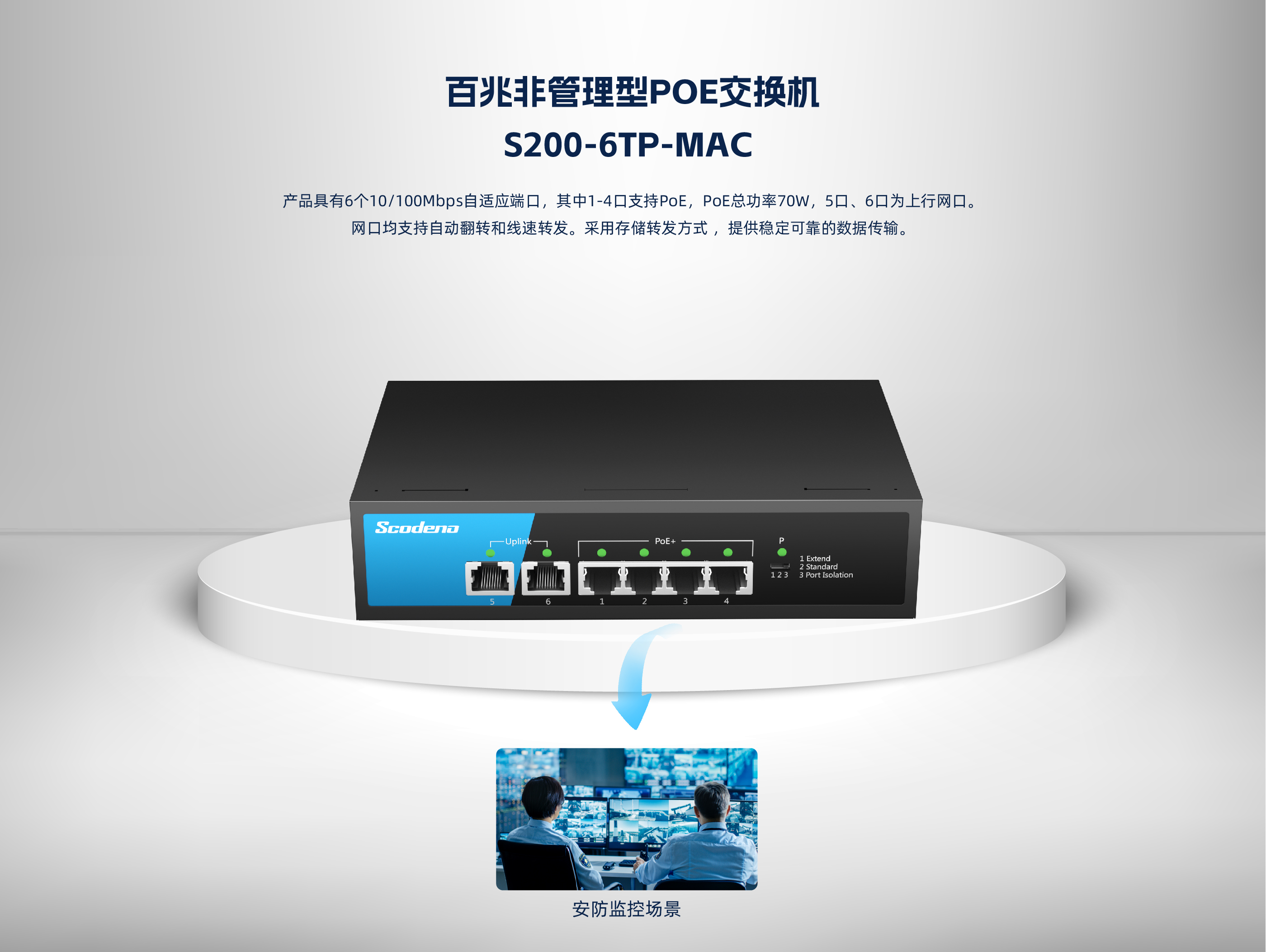 KP-6TP-MAC系列非管理型PoE交换机 ,具有6个10/100Mbps自适应端口 , 其中1-4口支持PoE , PoE总功率70W , 5口、6口为上行网口。网口均支持自动翻转 和线速转发。采用存储转发方式 ,提供稳定可靠的数据传输。