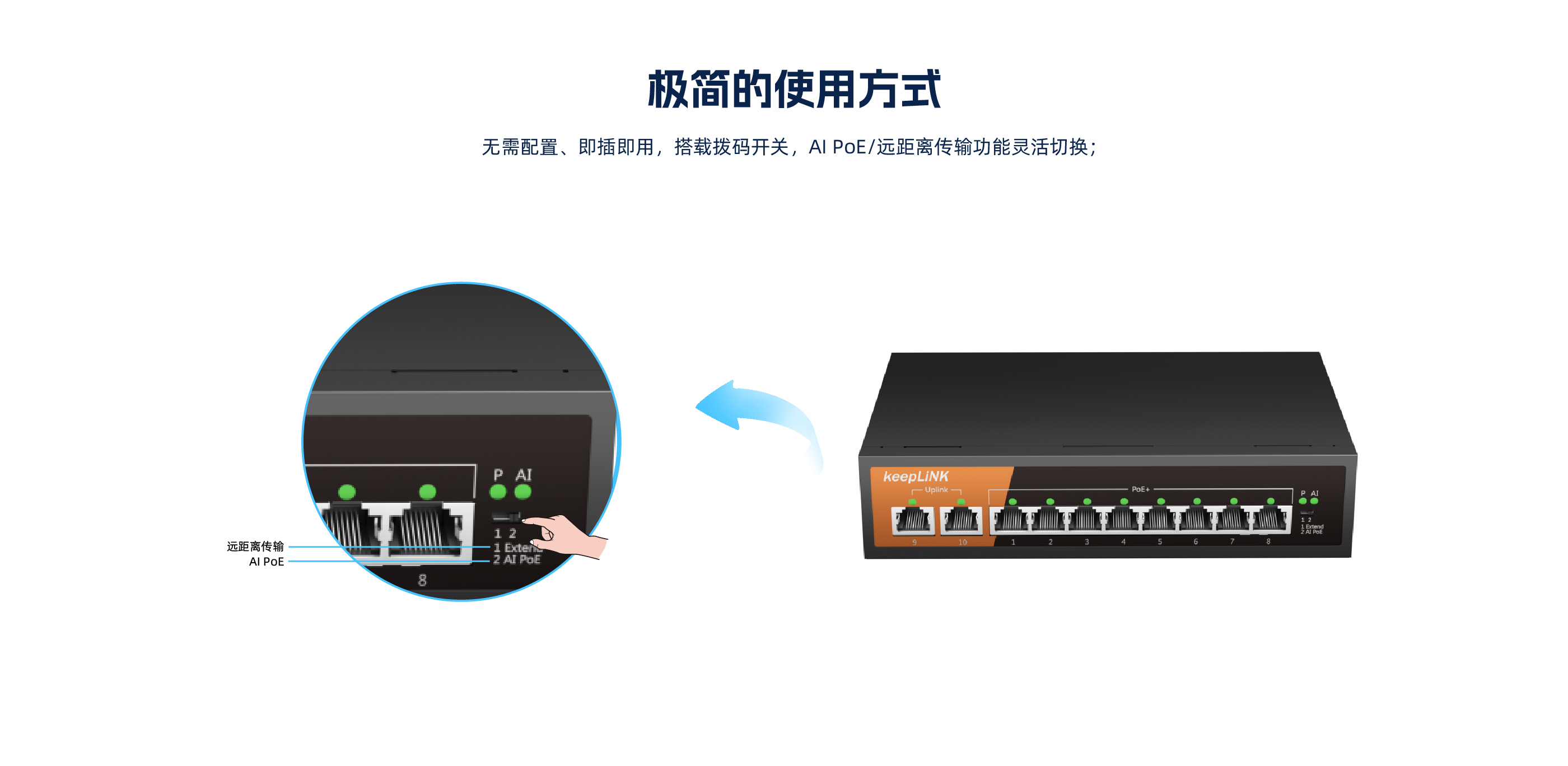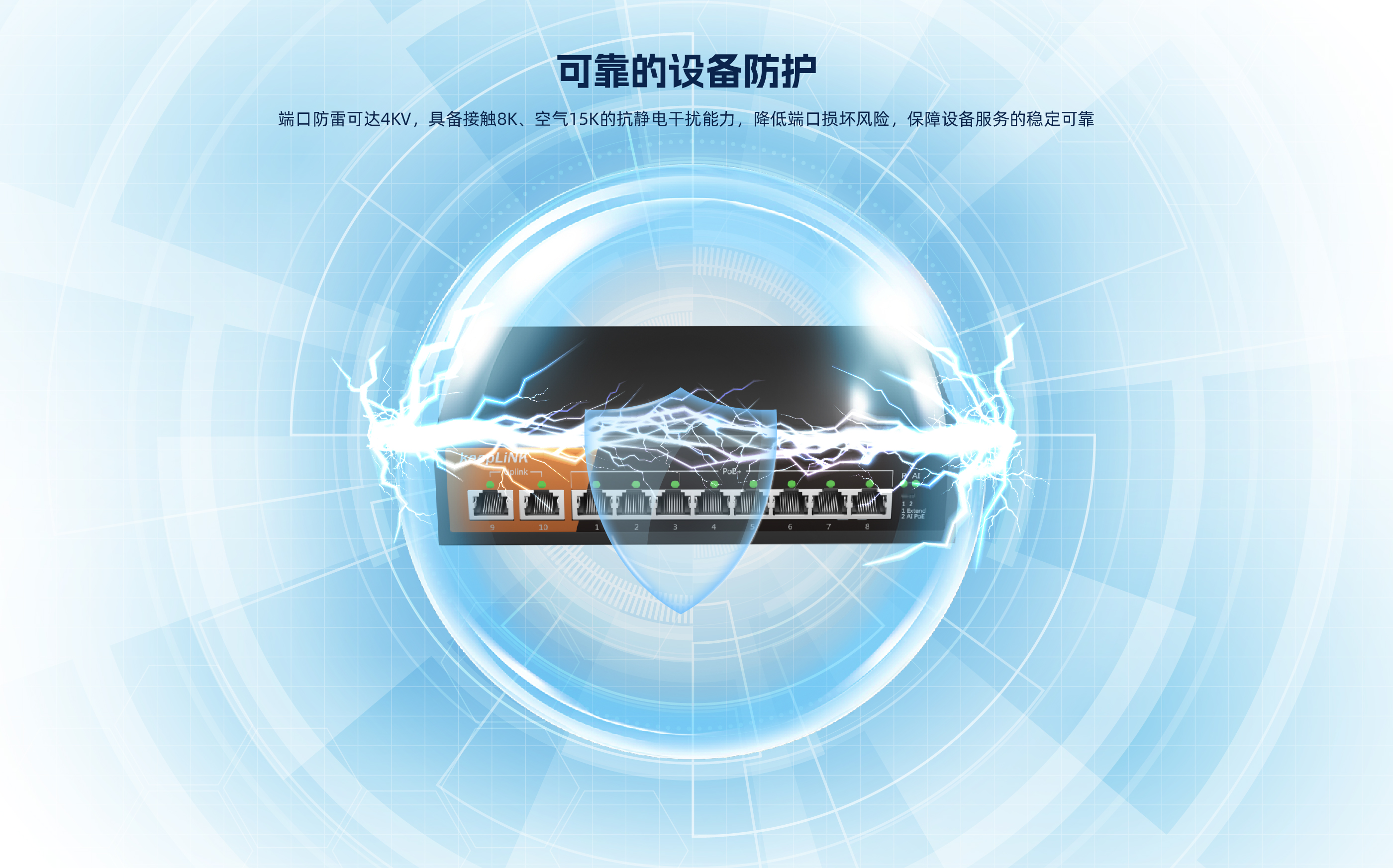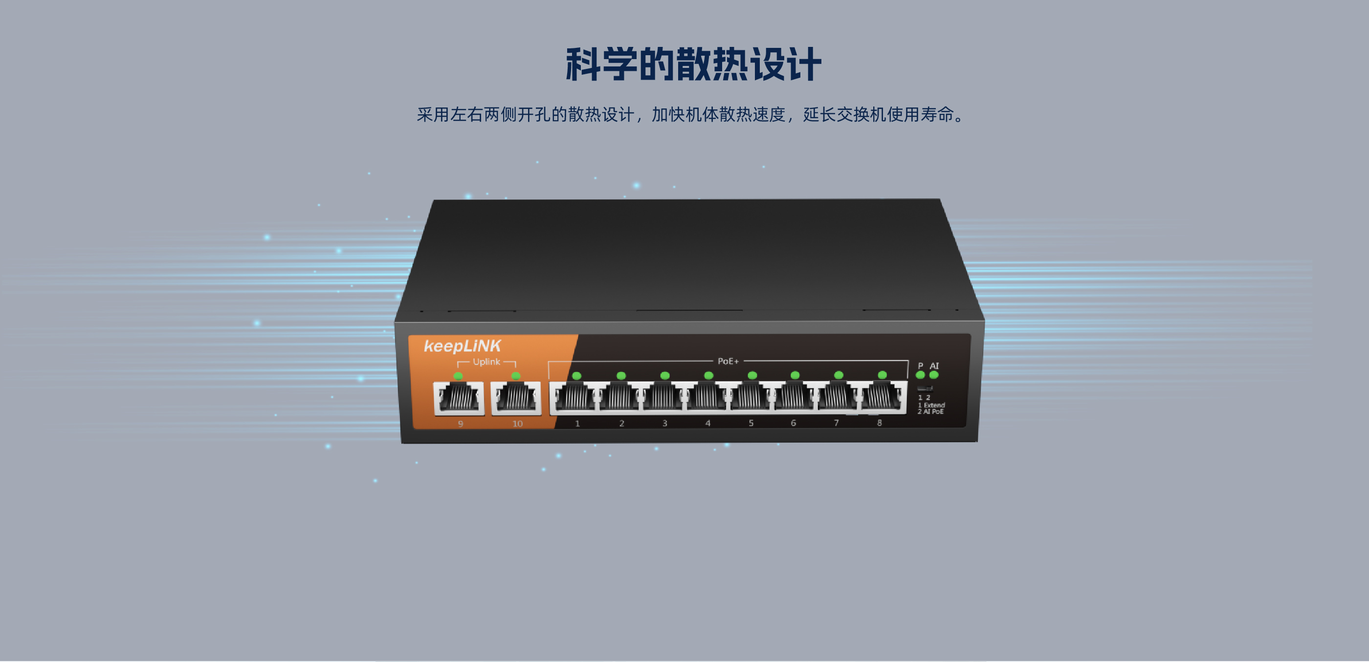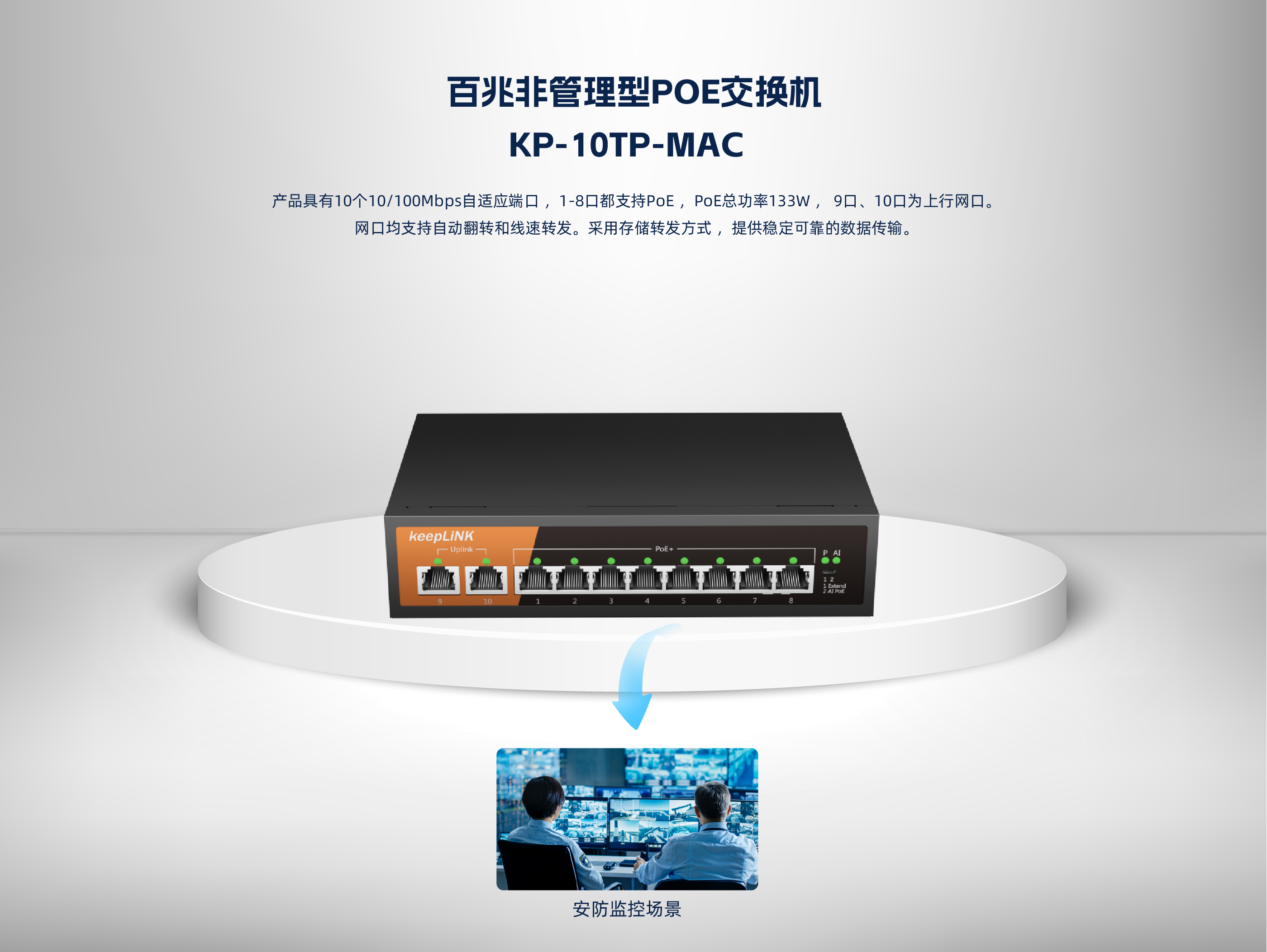 KP-10TP-MAC系列非管理型PoE交换机 ,具有10个10/100Mbps自适应端 口 , 1-8口都支持PoE , PoE总功率133W , 9口、 10口为上行网口。网口均支持自 动翻转和线速转发。采用存储转发方式 ,提供稳定可靠的数据传输。