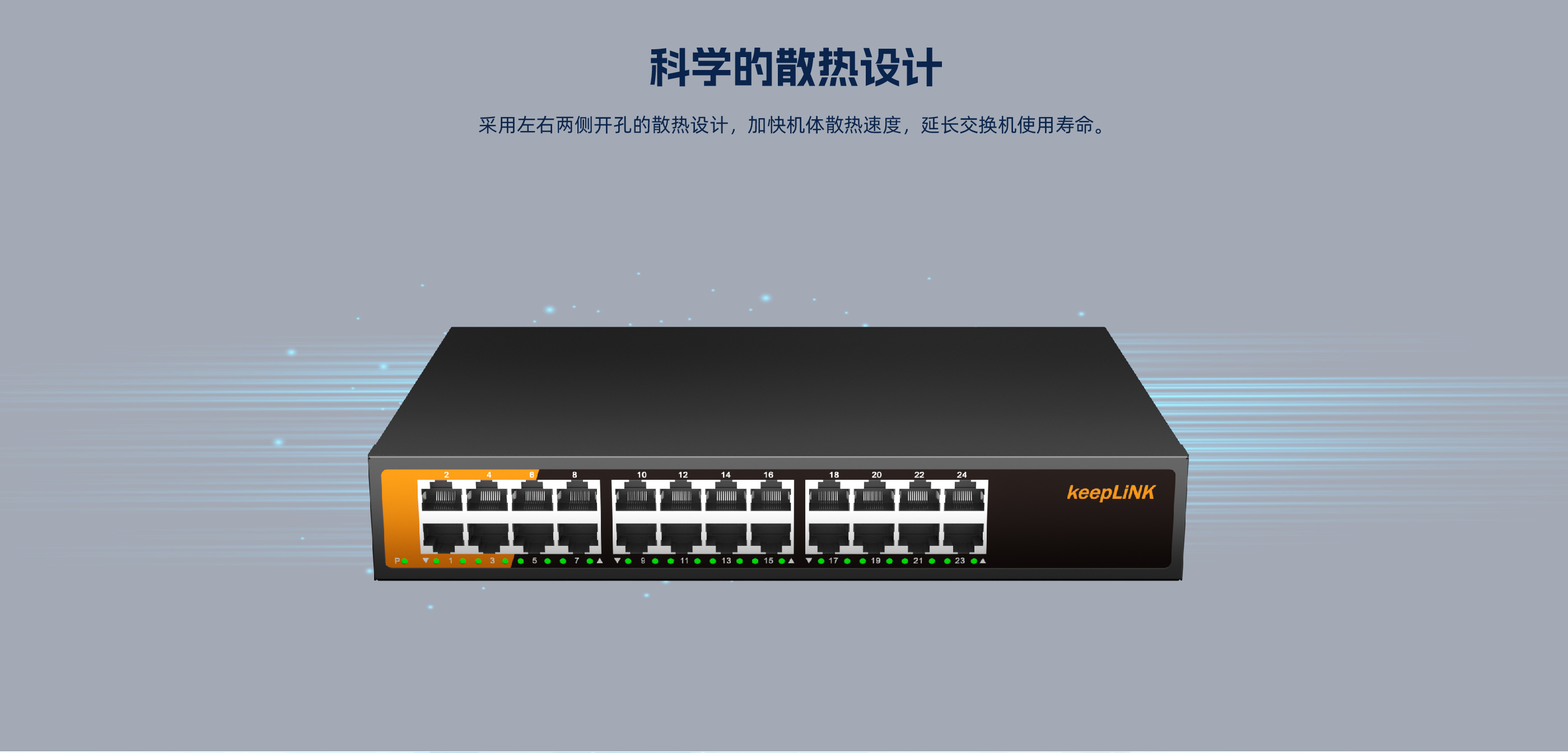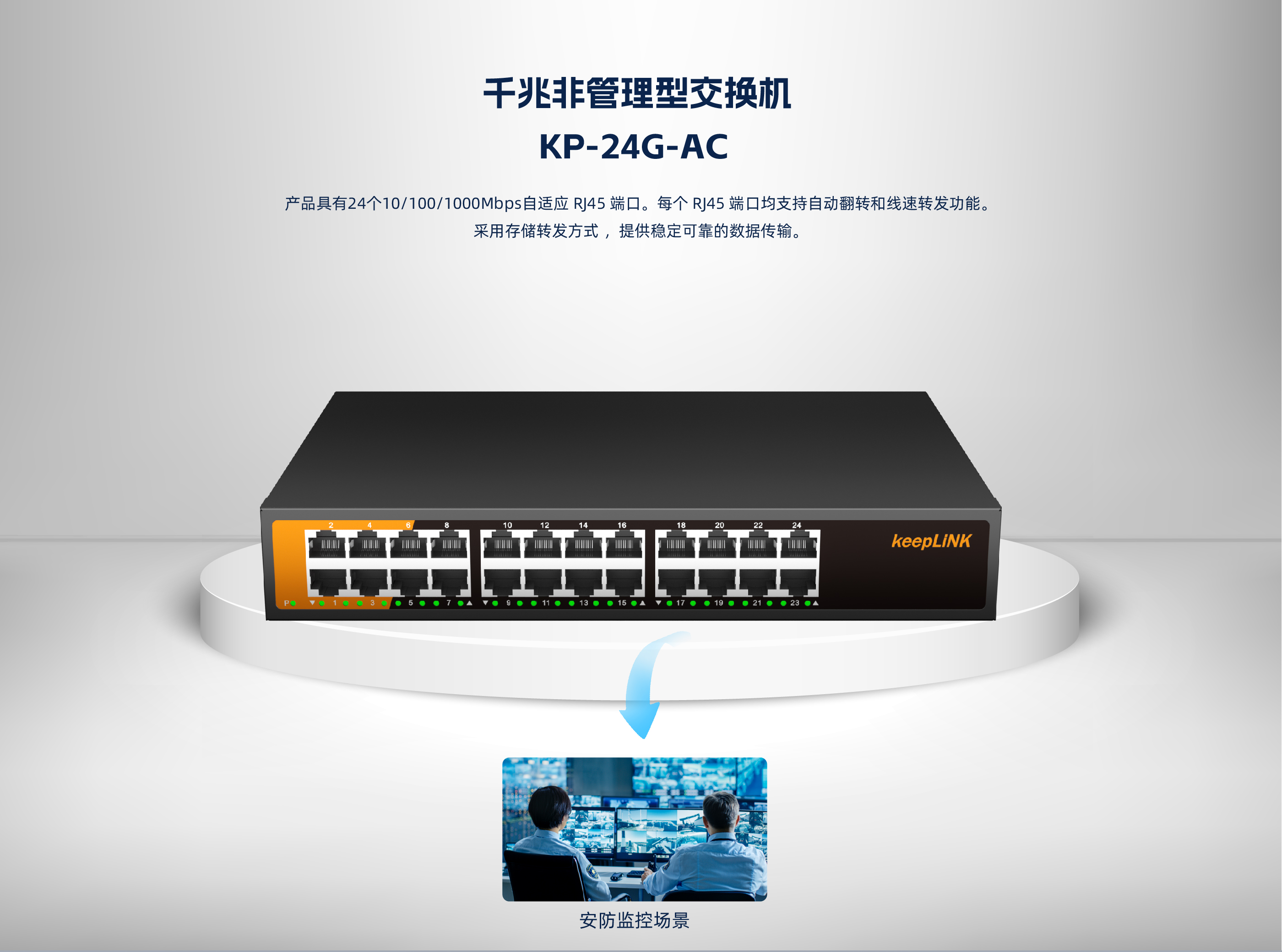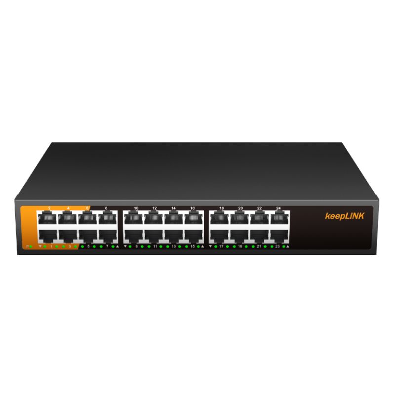 KP-24G-AC系列非管理型交换机 ,具有24个10/100/1000Mbps自适应 RJ45 端口。每个 RJ45 端口均支持自动翻转和线速转发功能。采用存储转发方式 ,提供稳定可靠的数据传输。