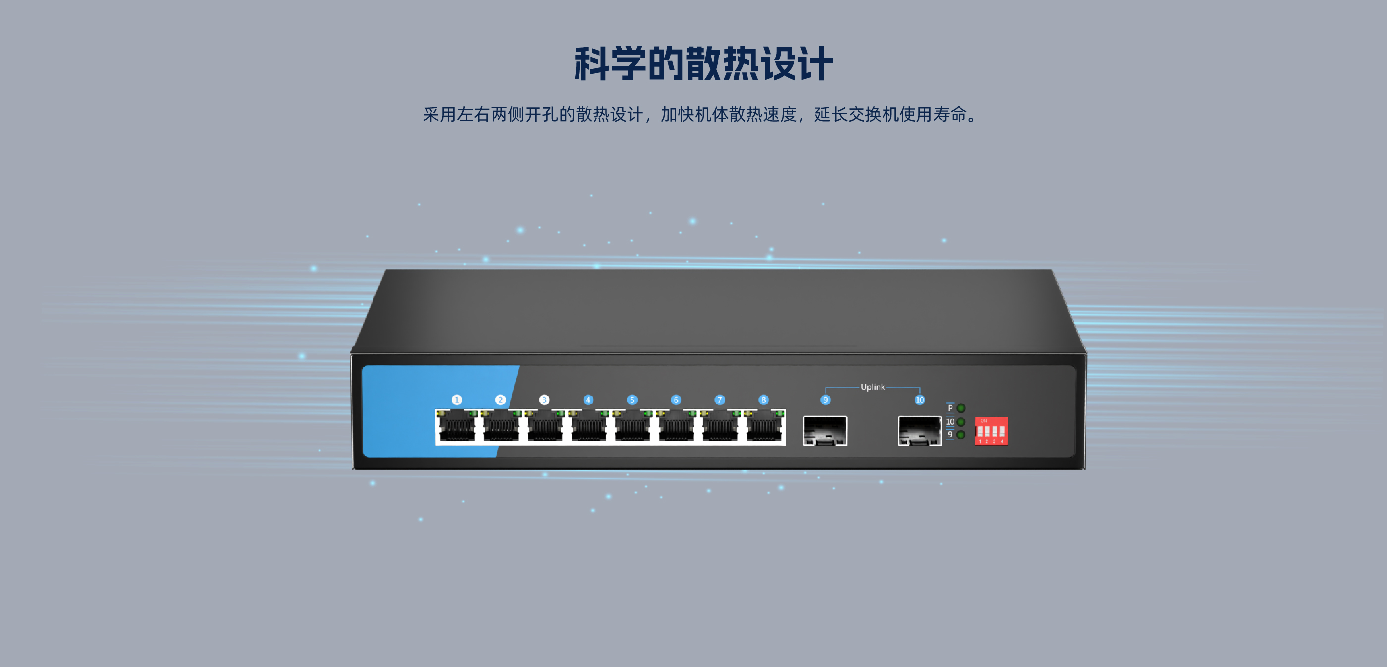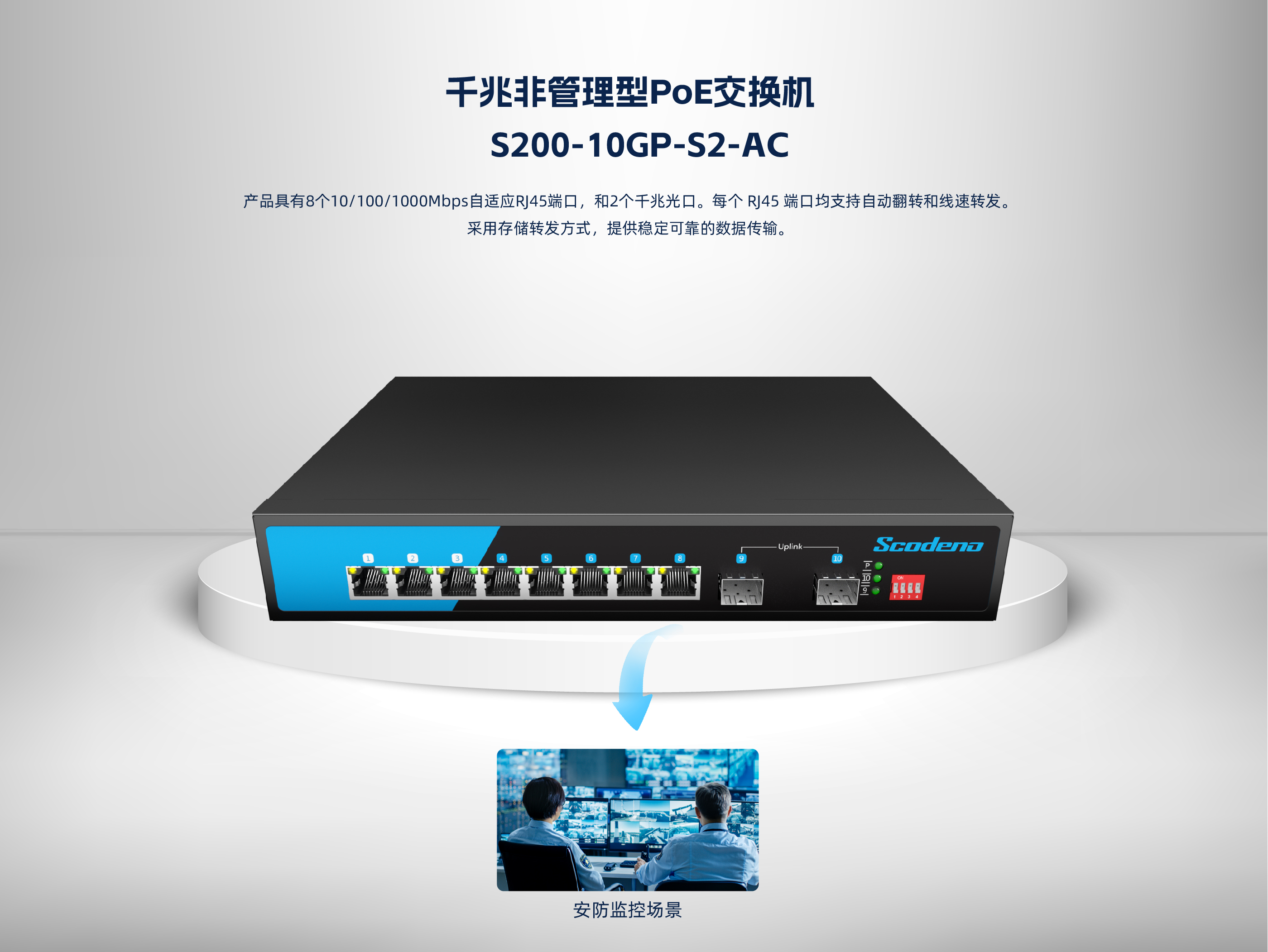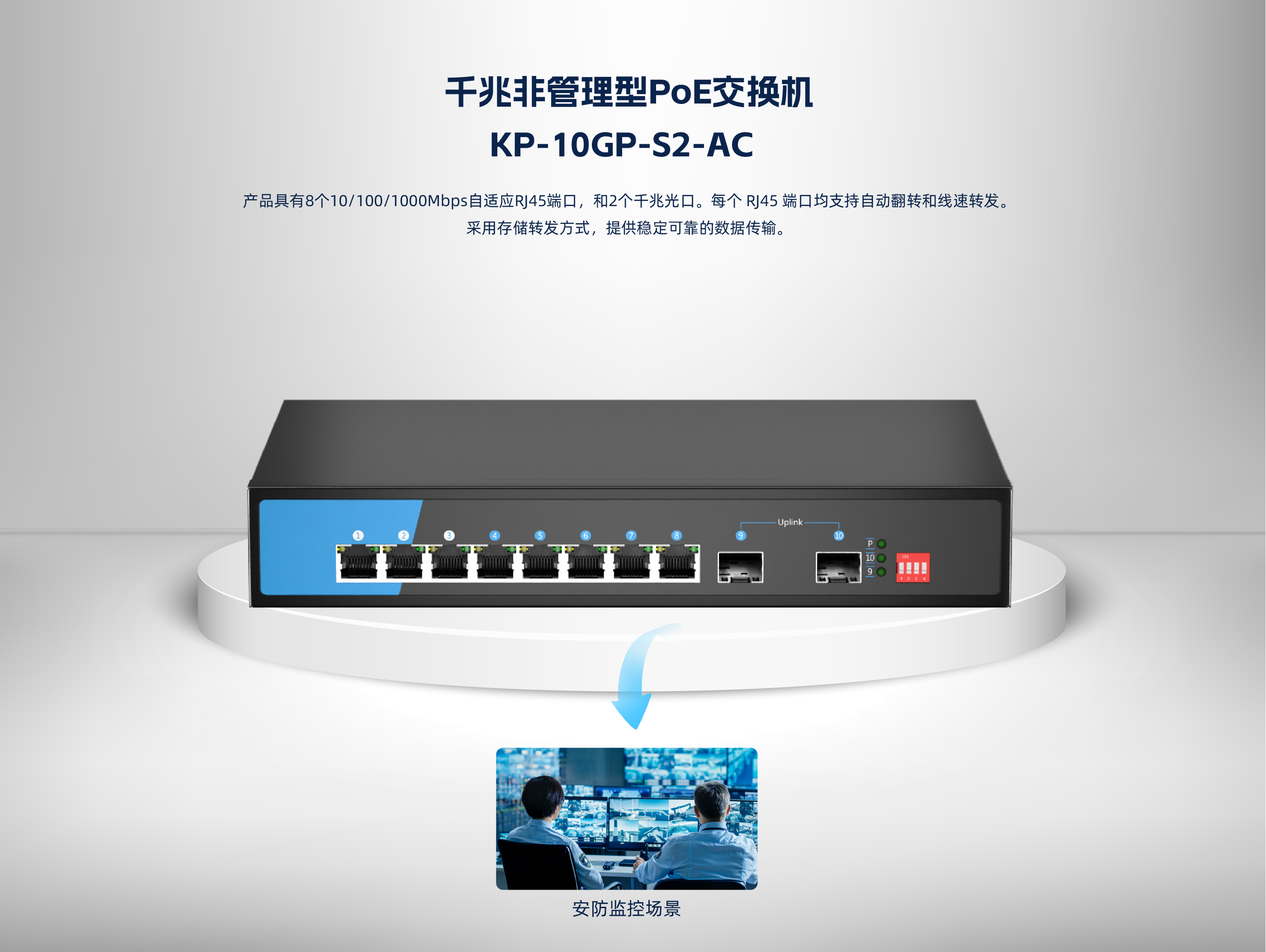 KP-10GP-S2-AC系列非管理型PoE交换机 ,具有8个10/100/1000Mbps自 适应 RJ45 端口 ,和2个千兆光口。每个 RJ45 端口均支持自动翻转和线速转发。采 用存储转发方式 ,提供稳定可靠的数据传输。