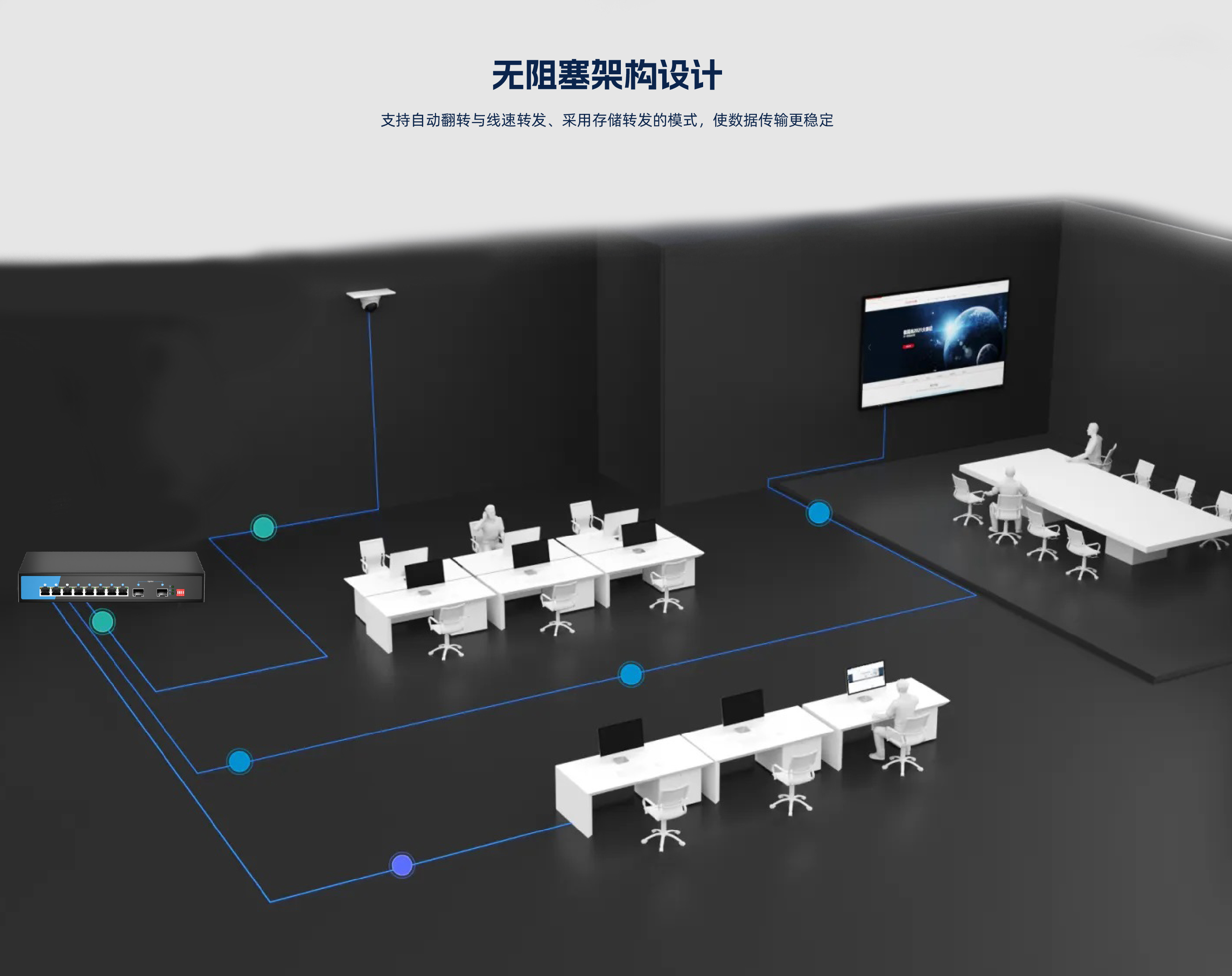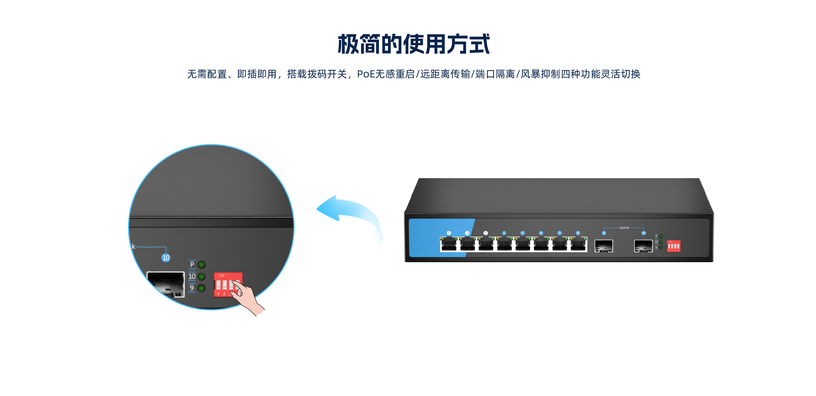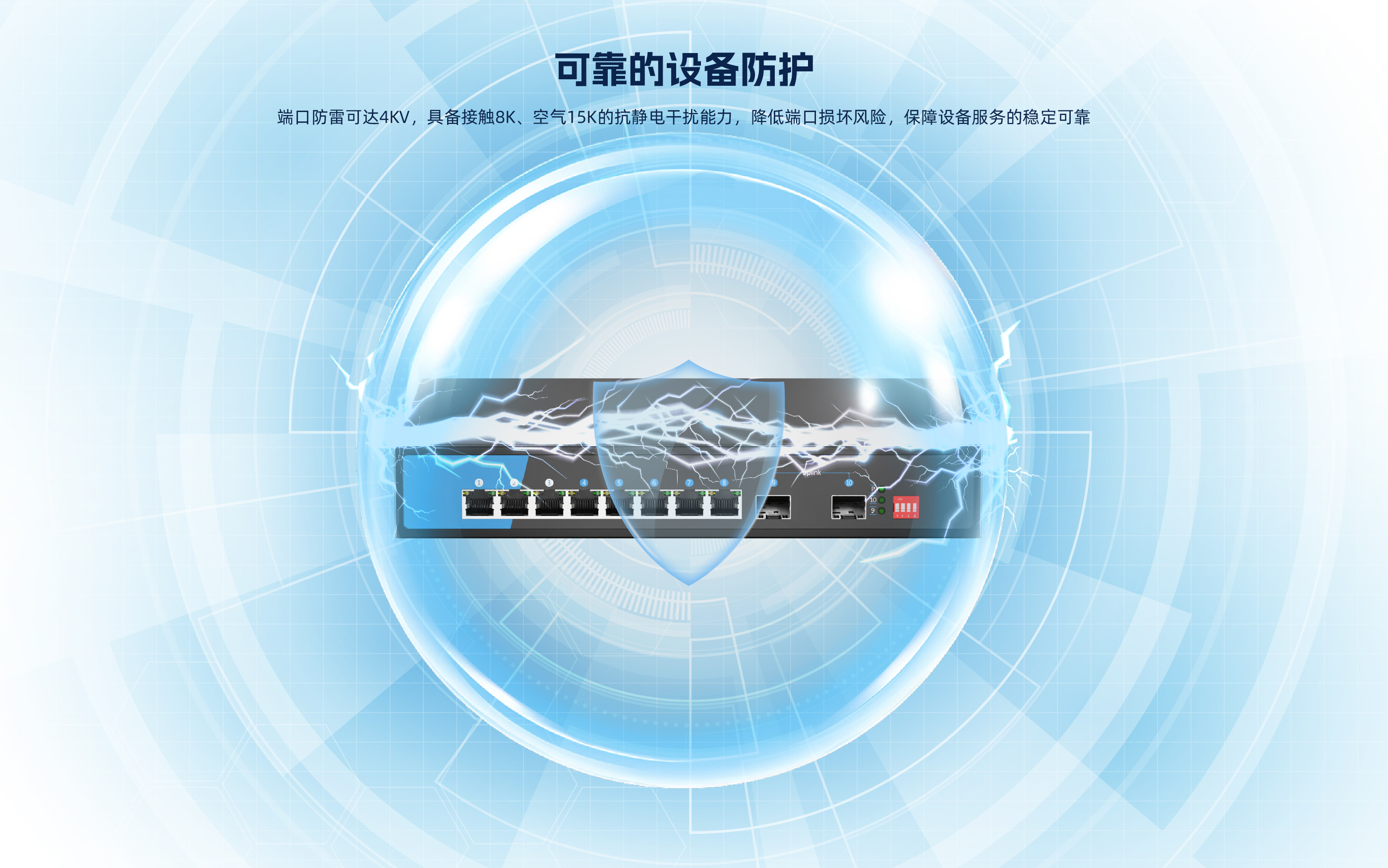 KP-10GP-S2-AC系列非管理型PoE交换机 ,具有8个10/100/1000Mbps自 适应 RJ45 端口 ,和2个千兆光口。每个 RJ45 端口均支持自动翻转和线速转发。采 用存储转发方式 ,提供稳定可靠的数据传输。