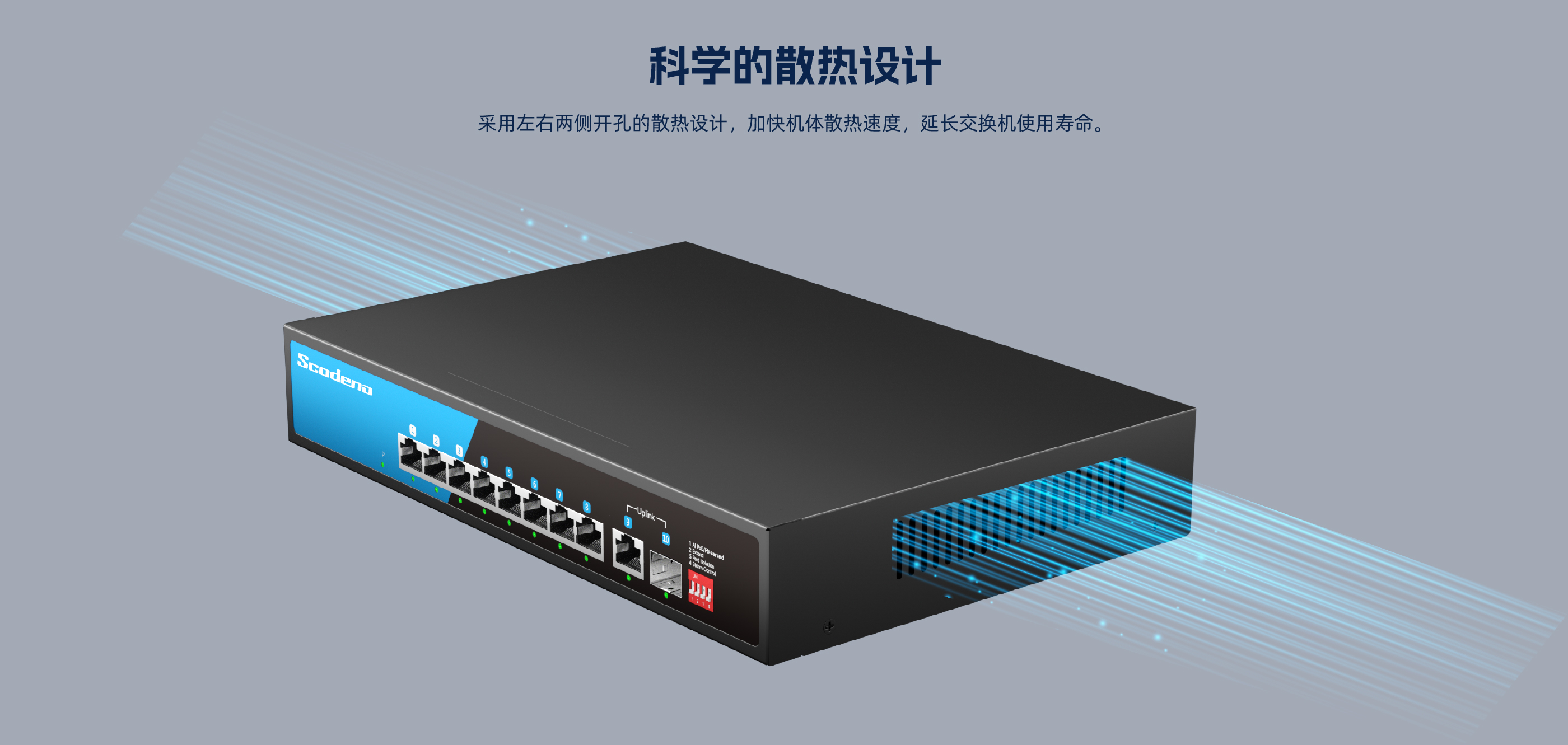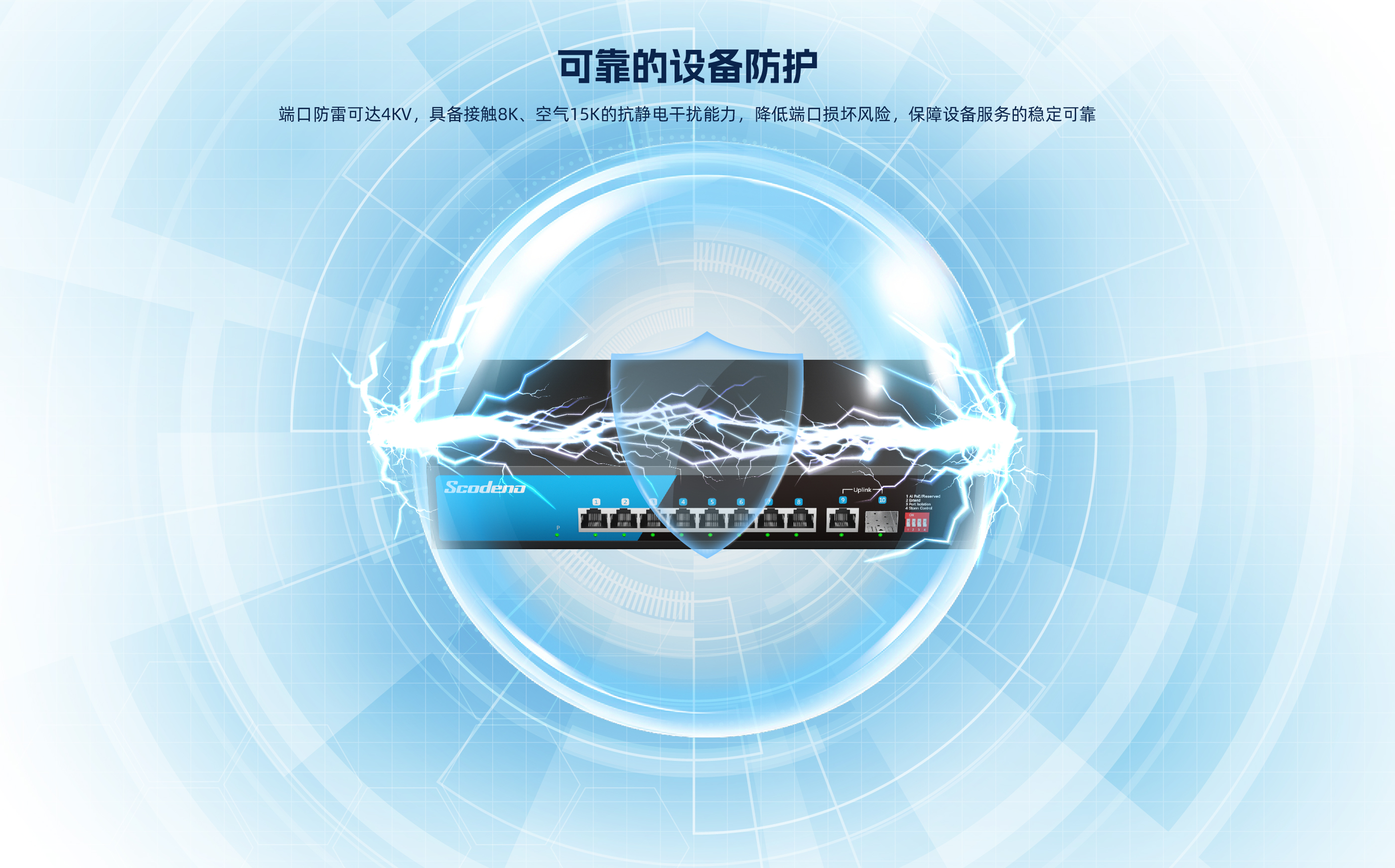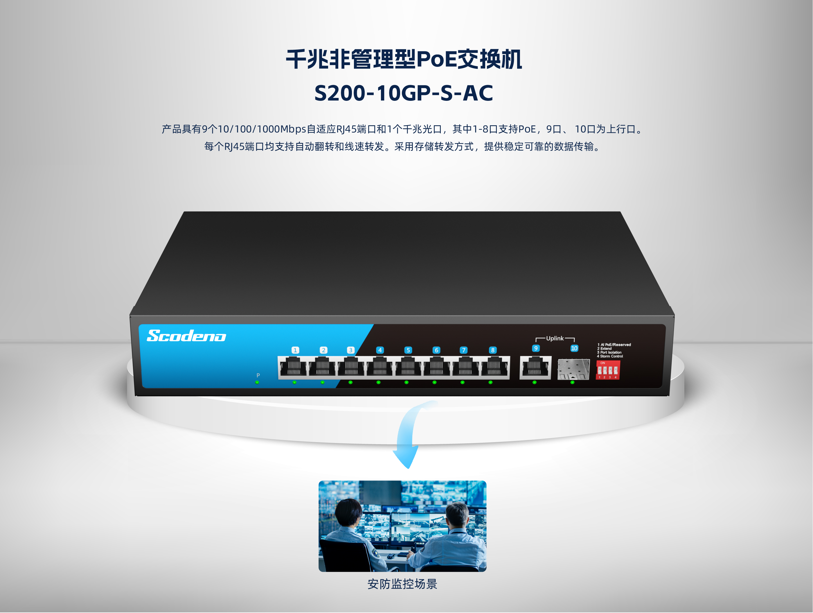 KP-10GP-S-AC系列非管理型PoE交换机 ,具有9个10/100/1000Mbps自适 应 RJ45 端口和1个千兆光口 ,其中1-8口支持POE ,9口、 10口为上行口。每个RJ45 端口均支持自动翻转和线速转发。采用存储转发方式 ,提供稳定可靠的数据传输。