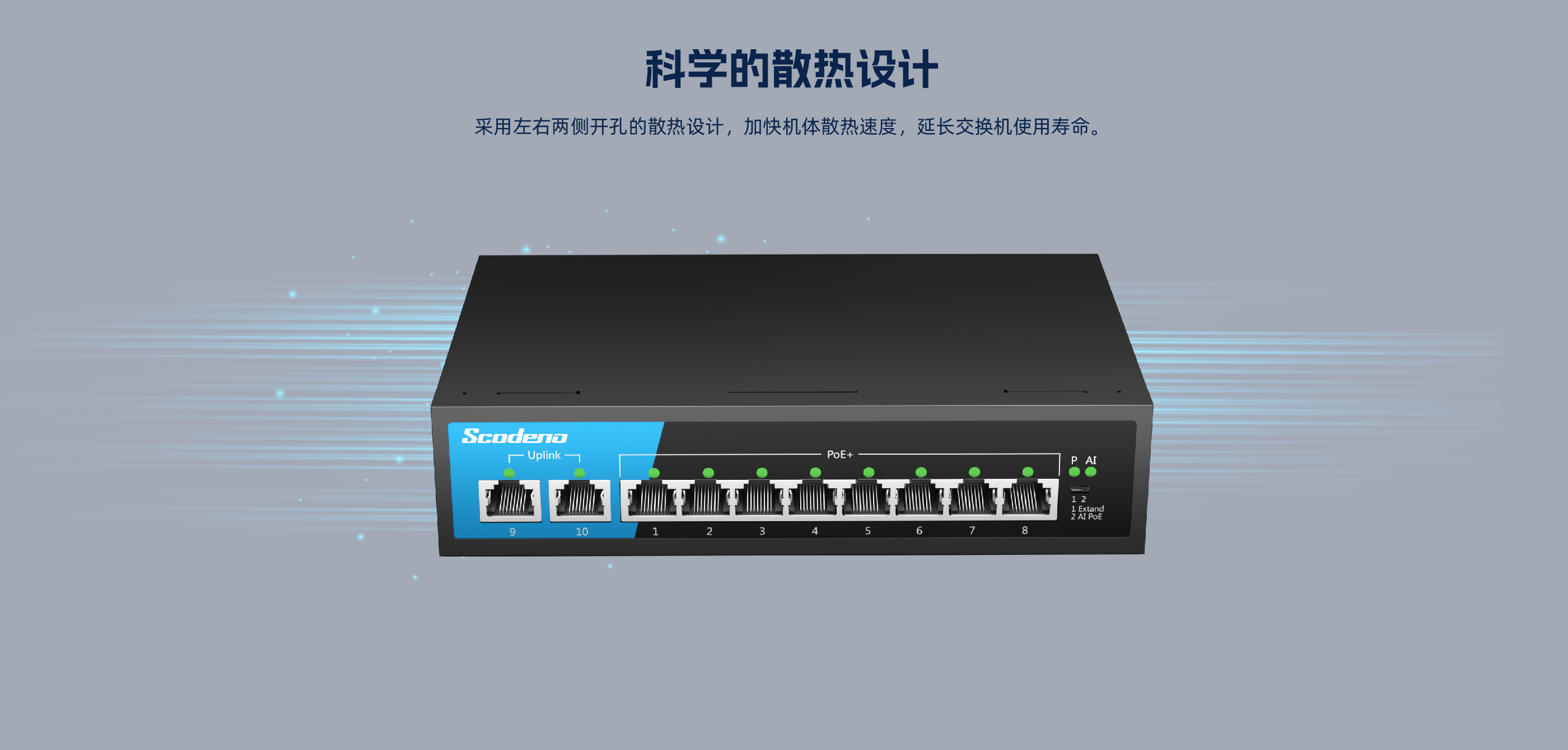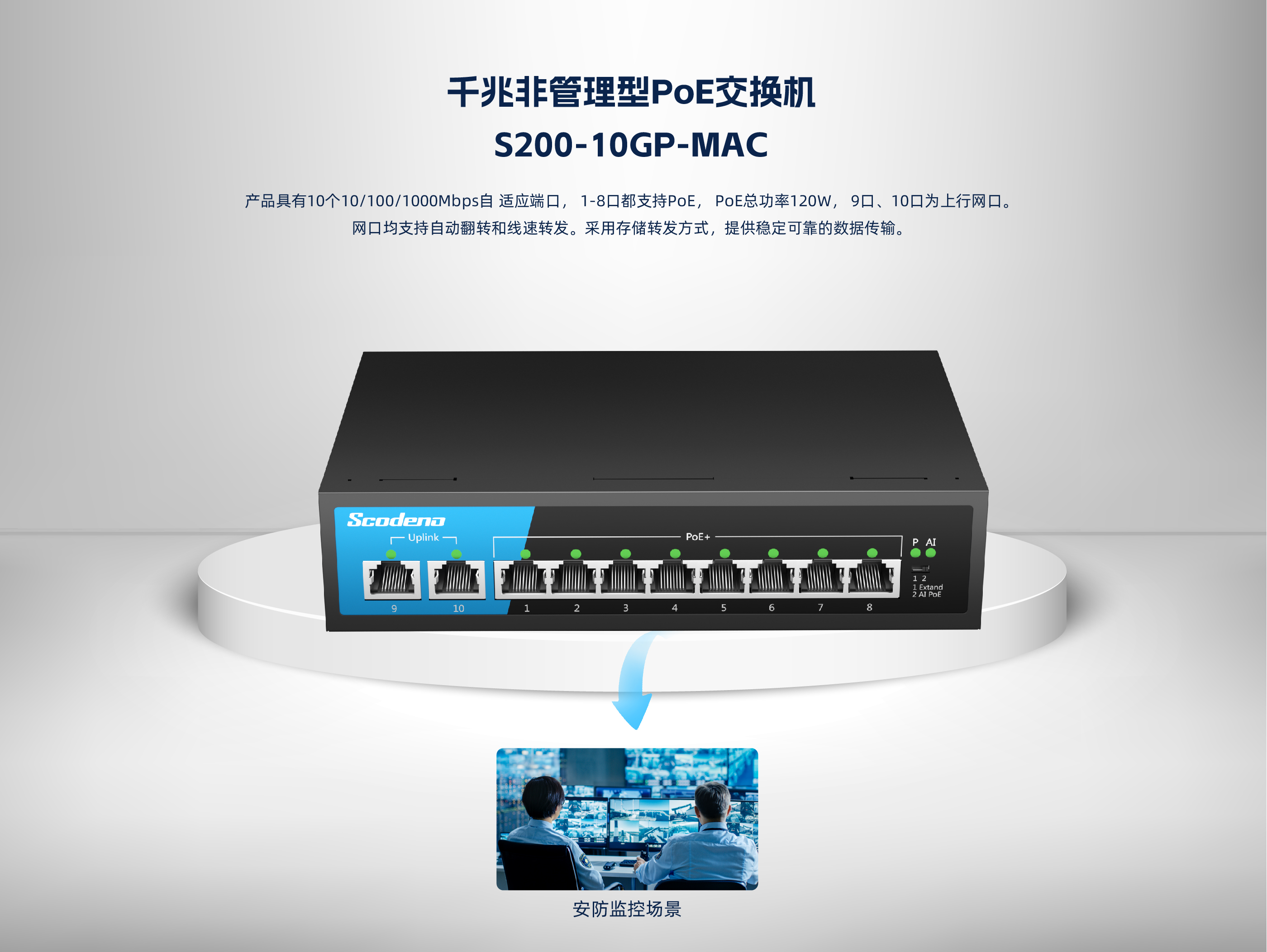 KP-10GP-MAC系列非管理型PoE交换机 ,具有10个10/100/1000Mbps自 适应端口 , 1-8口都支持PoE , PoE总功率120W , 9口、 10口为上行网口。网口均 支持自动翻转和线速转发。采用存储转发方式 ,提供稳定可靠的数据传输。