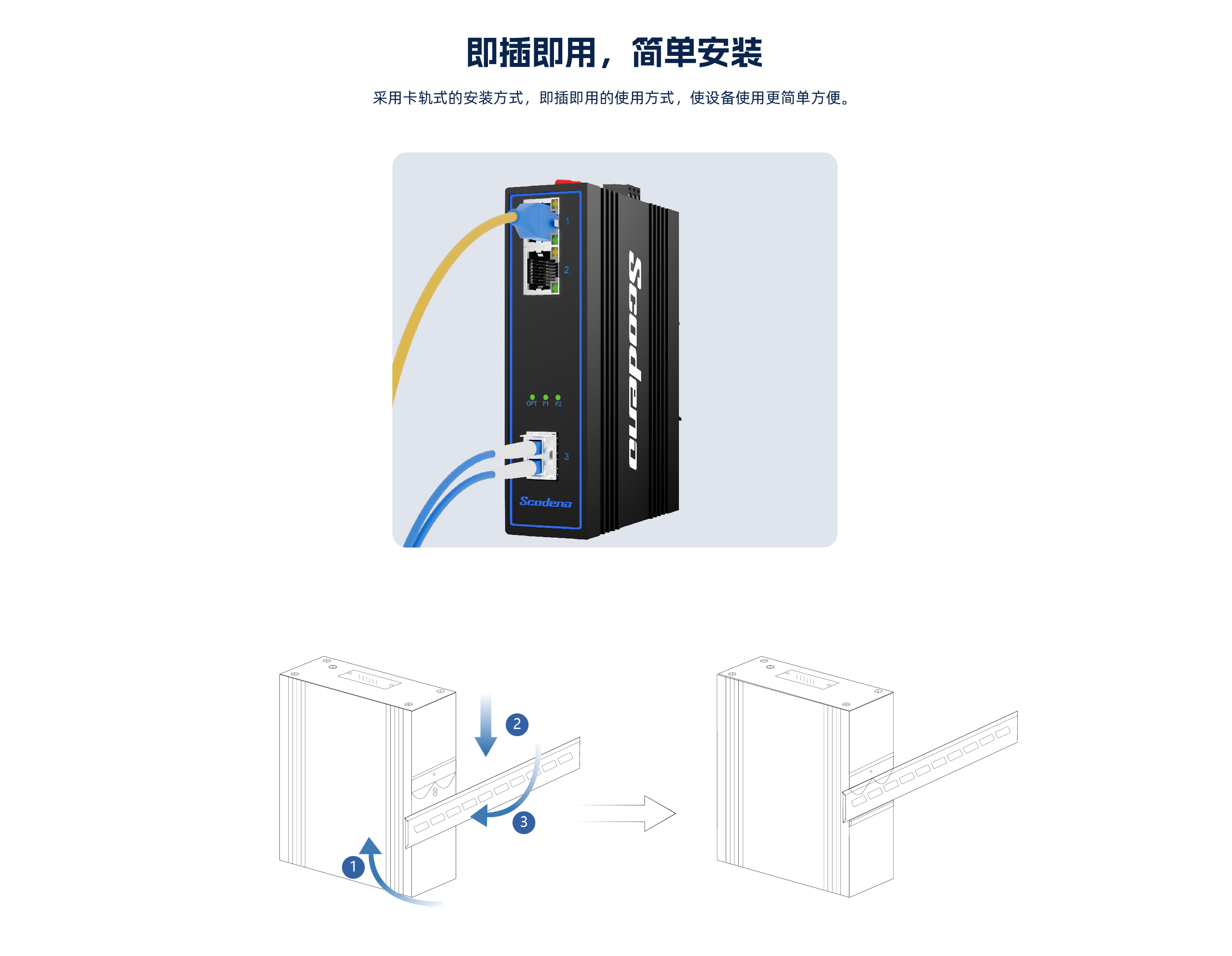 此设备是1个100M光口&2个10/100M自适应网口工业以太网快速交换机,POE 可选 ,通过无风扇散热电路设计、宽范围工作环境温度、高防护等级等技术 ,提供了 耐高/低温、防雷等卓越的工业级品质 ,增强了工业网络的可靠性和安全性。更能满足 轨道交通、平安城市、智能交通、室外监控和其他恶劣环境中的部署要求。