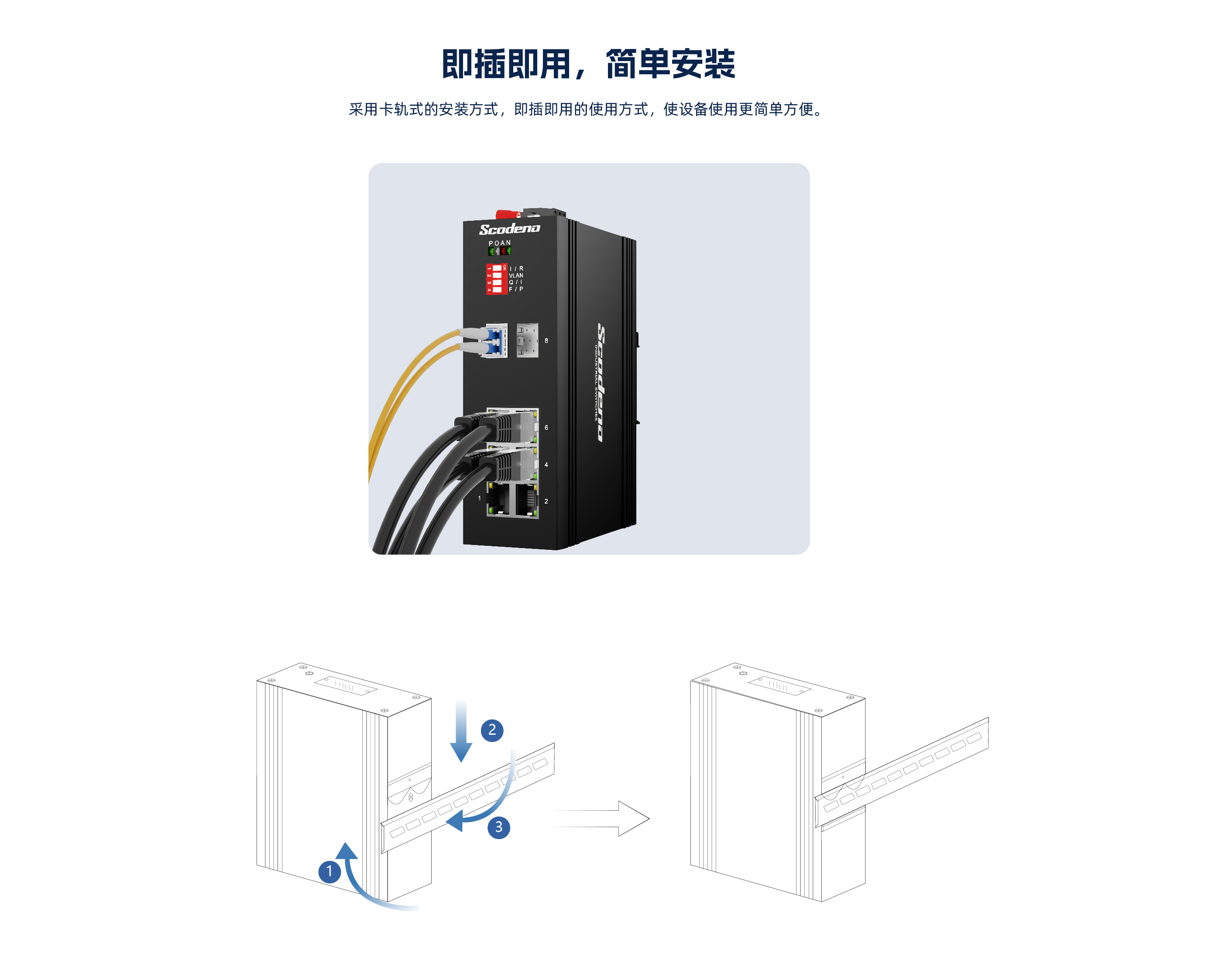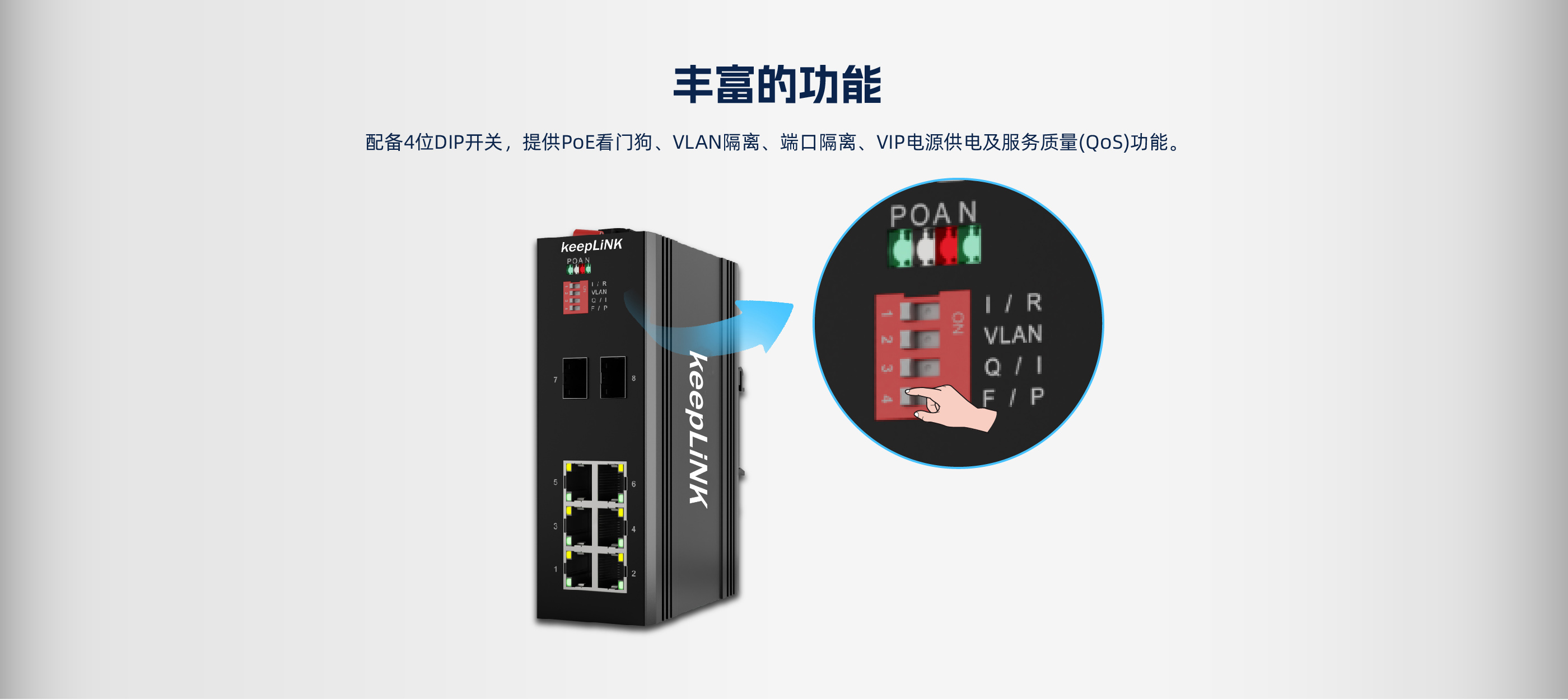 KP-9000-65-2FX6TP | 2个百兆SFP光接口(光口可选SC,ST,FC), 6个10/100M自适应电口,支持PoE&PoE+ |