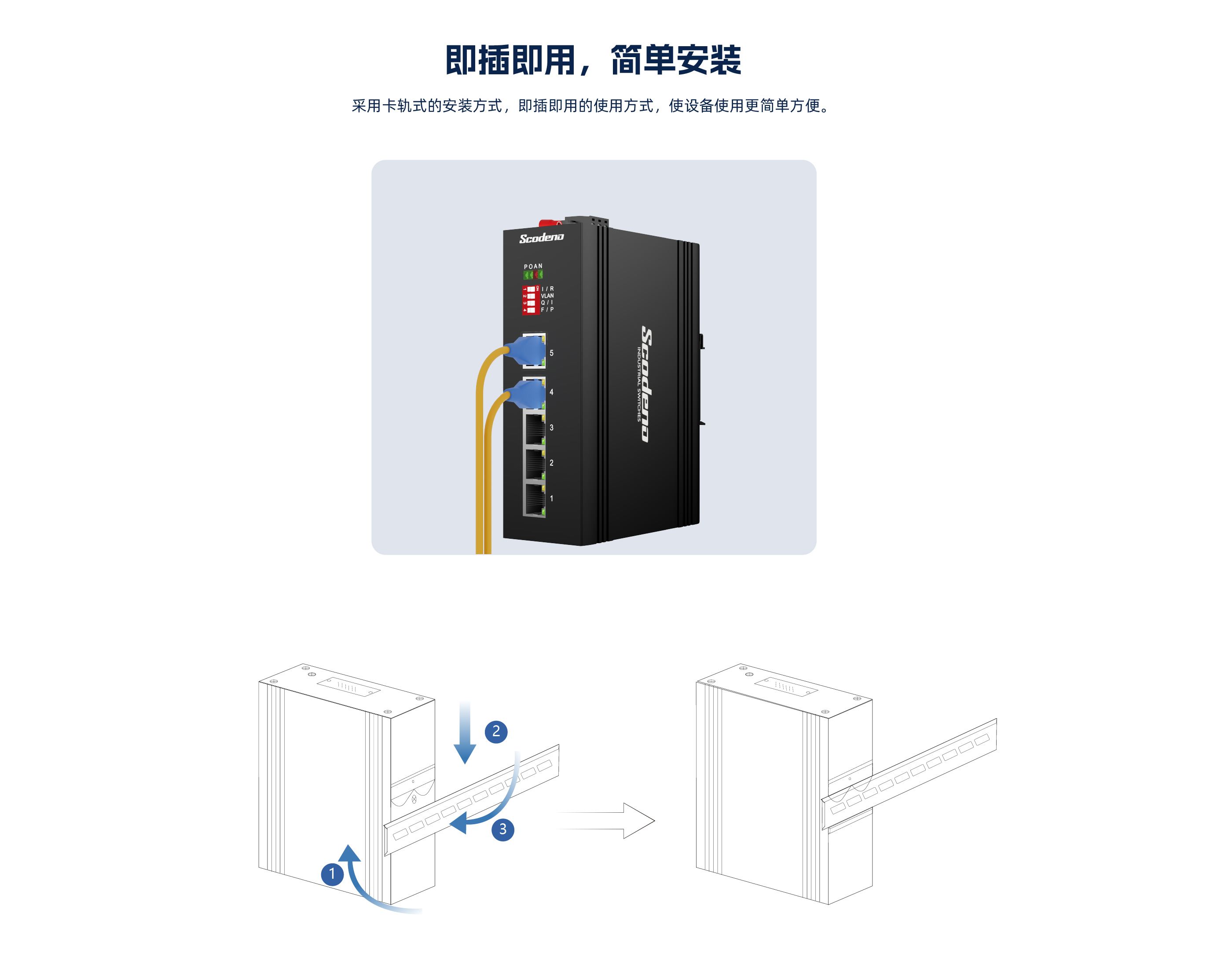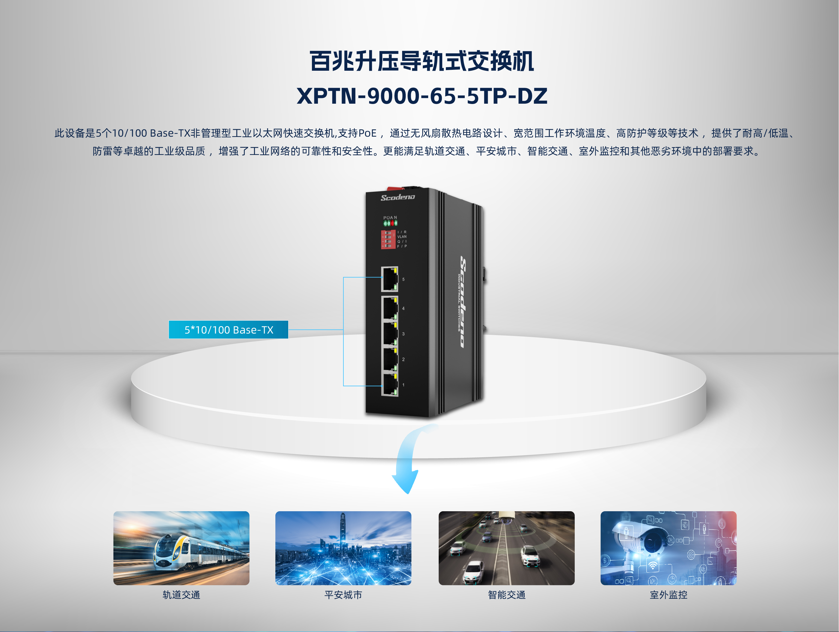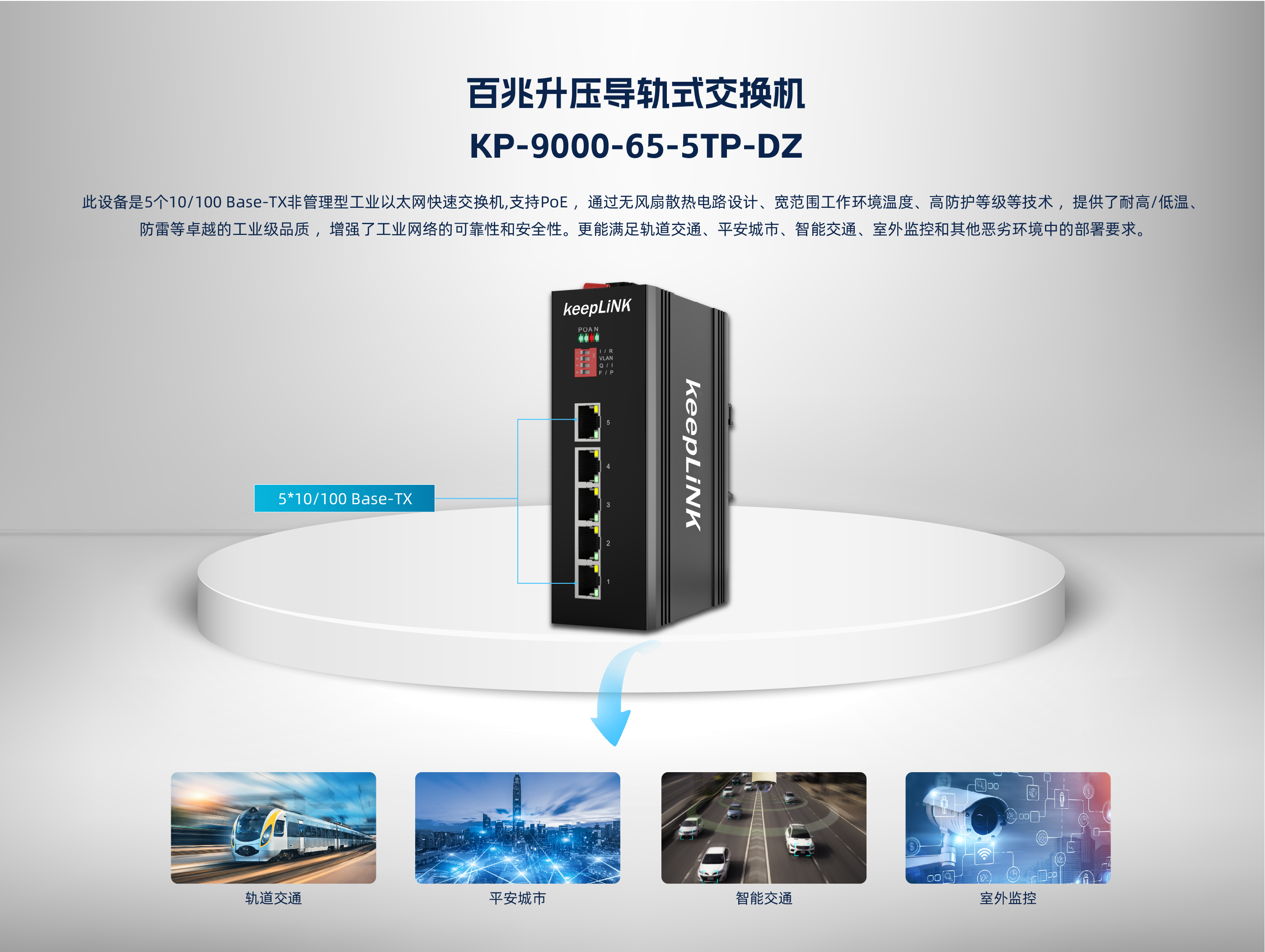 此设备是5个10/100 Base-T非管理型工业以太网快速交换机,支持POE ,通过 无风扇散热电路设计、宽范围工作环境温度、高防护等级等技术 ,提供了耐高/低温、 防雷等卓越的工业级品质 ,增强了工业网络的可靠性和安全性。更能满足轨道交通、 平安城市、智能交通、室外监控和其他恶劣环境中的部署要求。