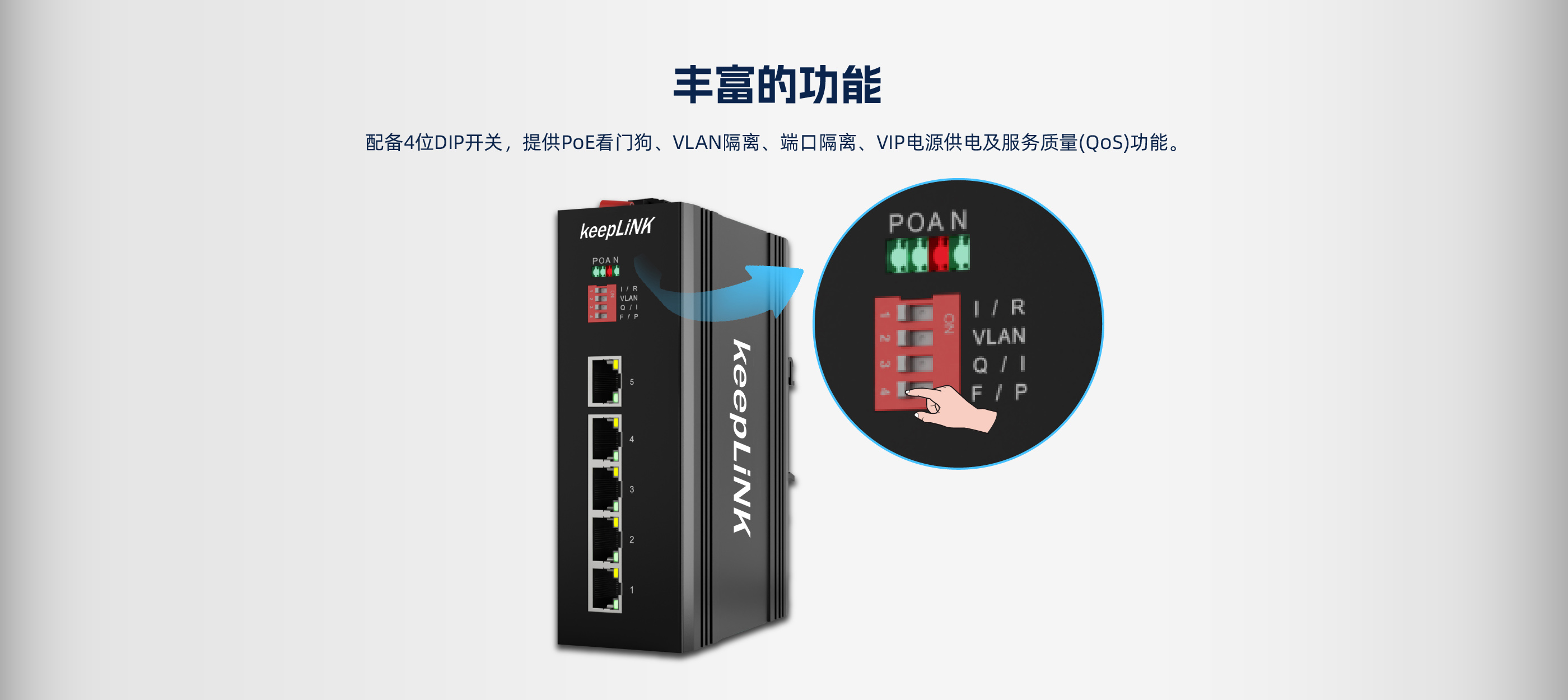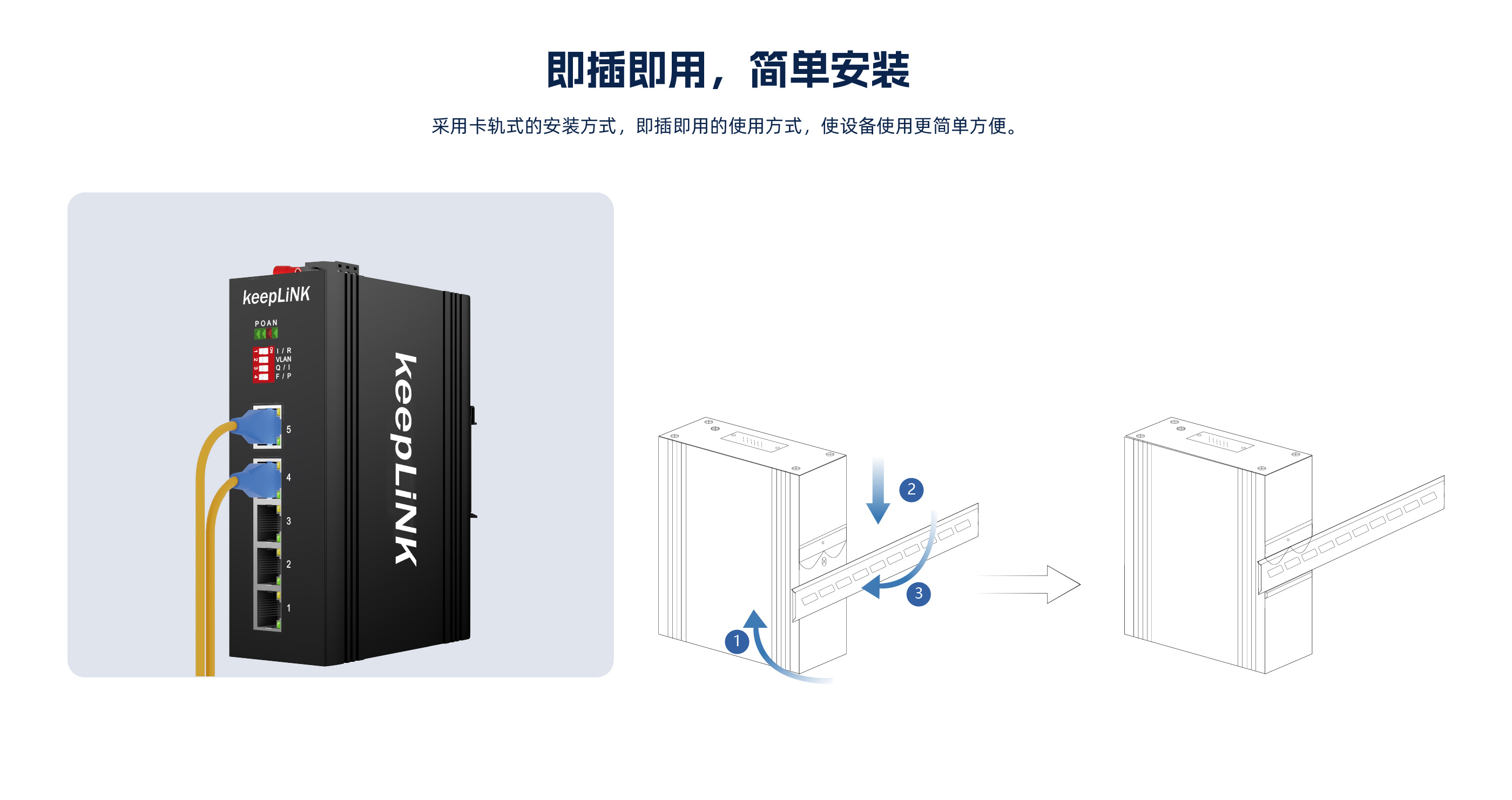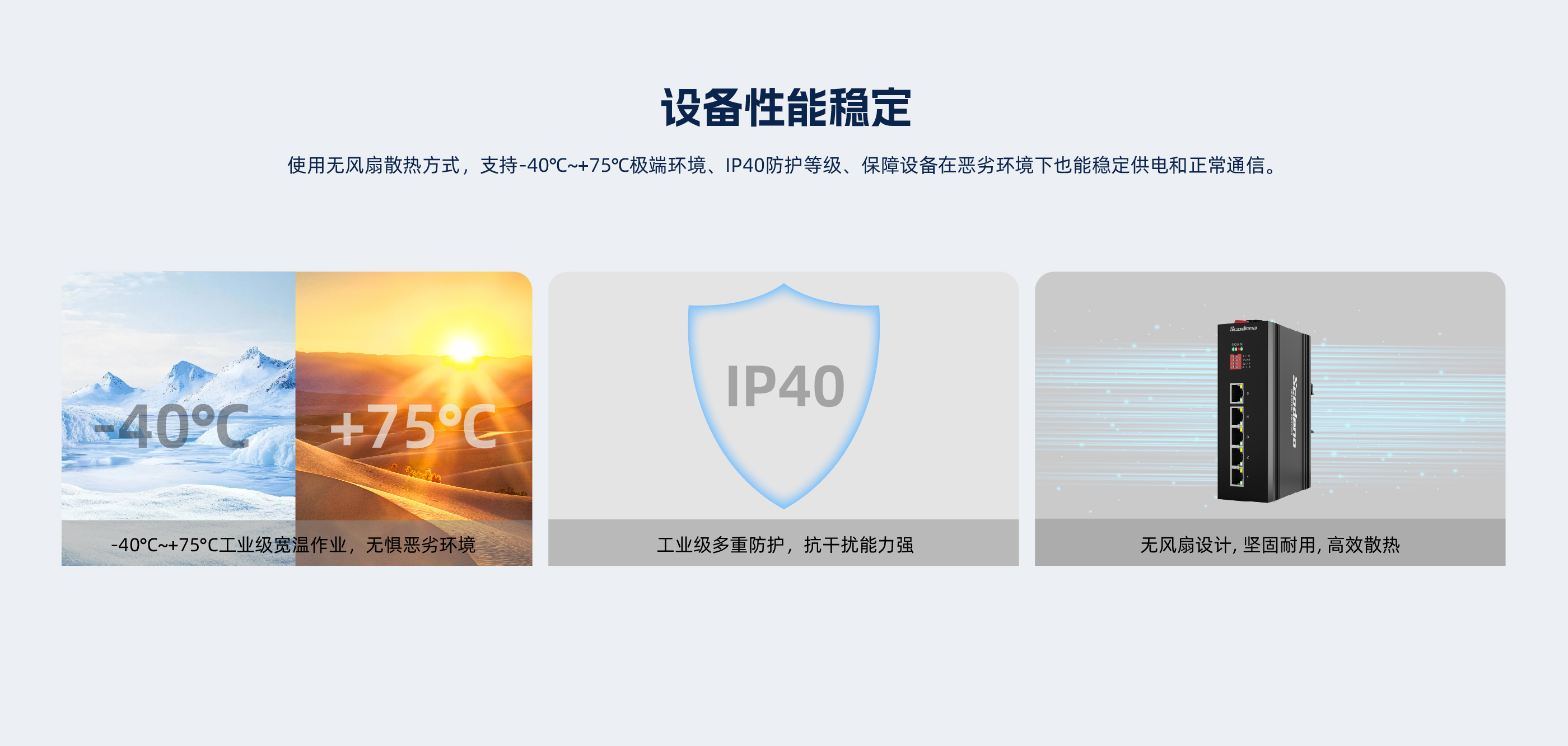 此设备是5个10/100 Base-T非管理型工业以太网快速交换机,支持POE ,通过 无风扇散热电路设计、宽范围工作环境温度、高防护等级等技术 ,提供了耐高/低温、 防雷等卓越的工业级品质 ,增强了工业网络的可靠性和安全性。更能满足轨道交通、 平安城市、智能交通、室外监控和其他恶劣环境中的部署要求。