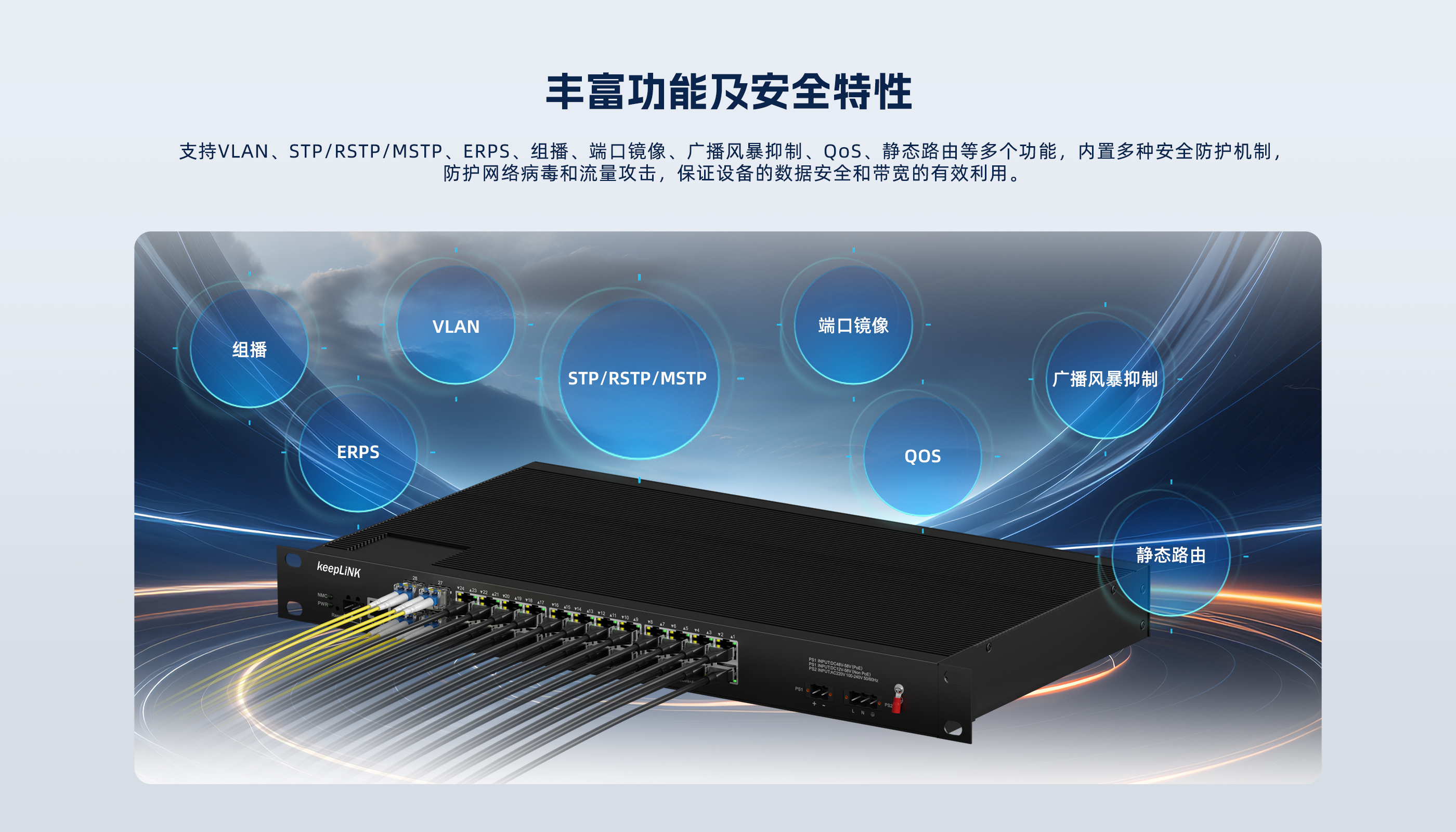 KP-9000-85-4GX24GP-R-V | 4千兆光, 24个10/100/1000M自适应电口,双DC供电,支持PoE&PoE+ |