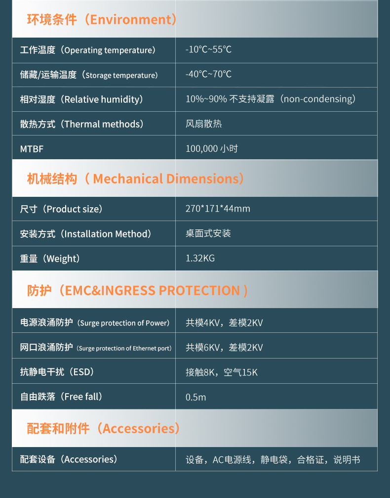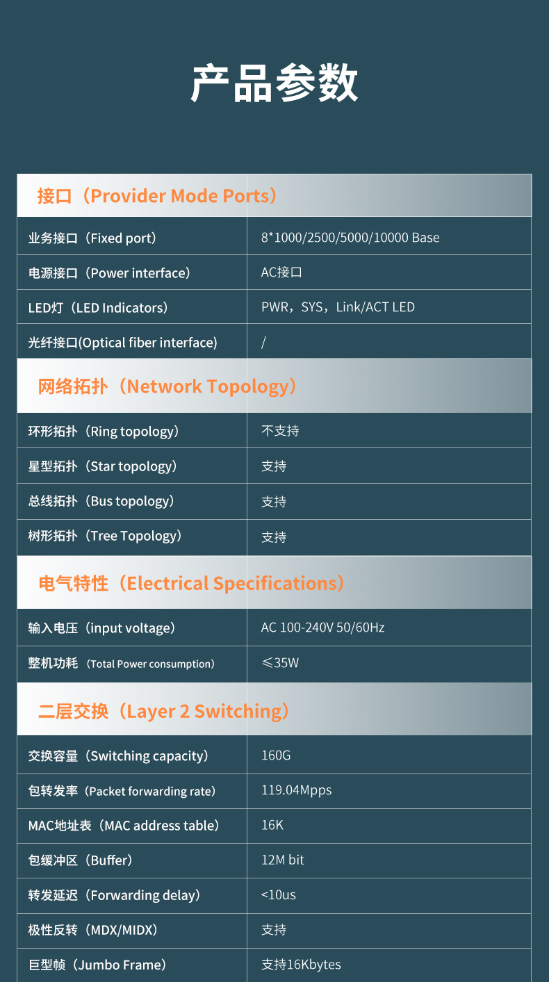 | 业务接口( Fixed port) | 8*1000/2500/5000/10000 Base | |||||||