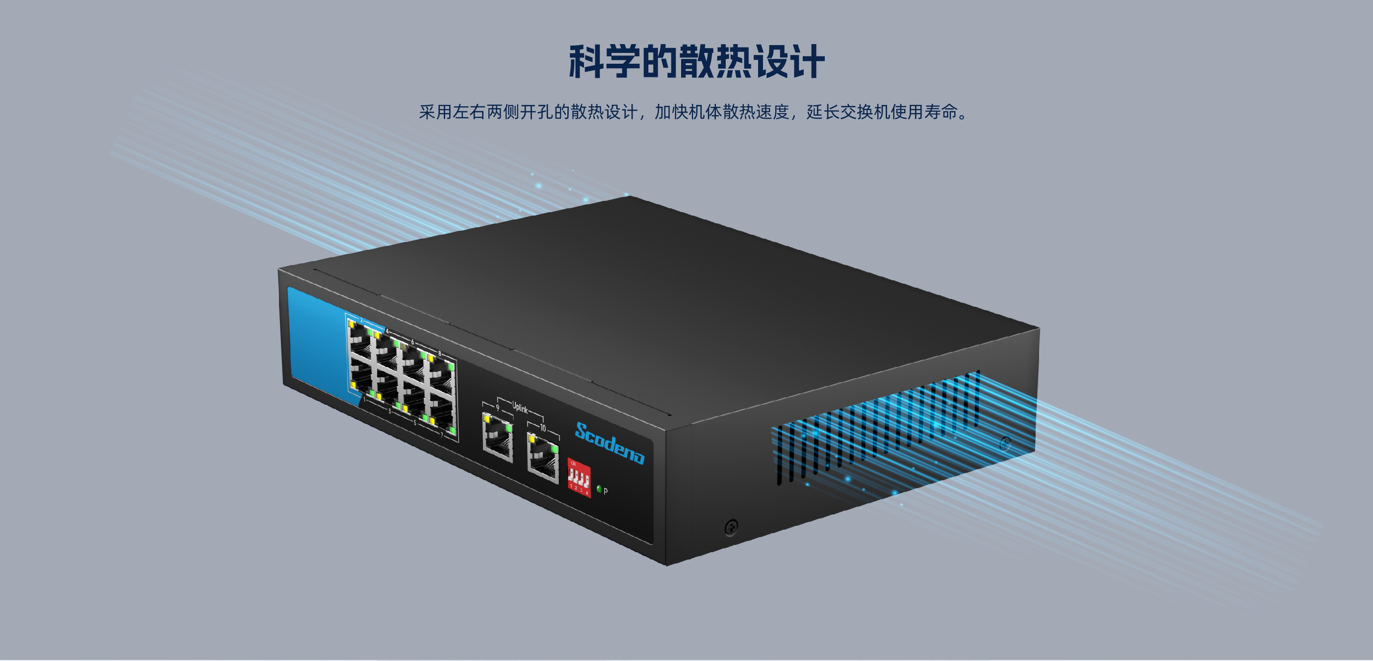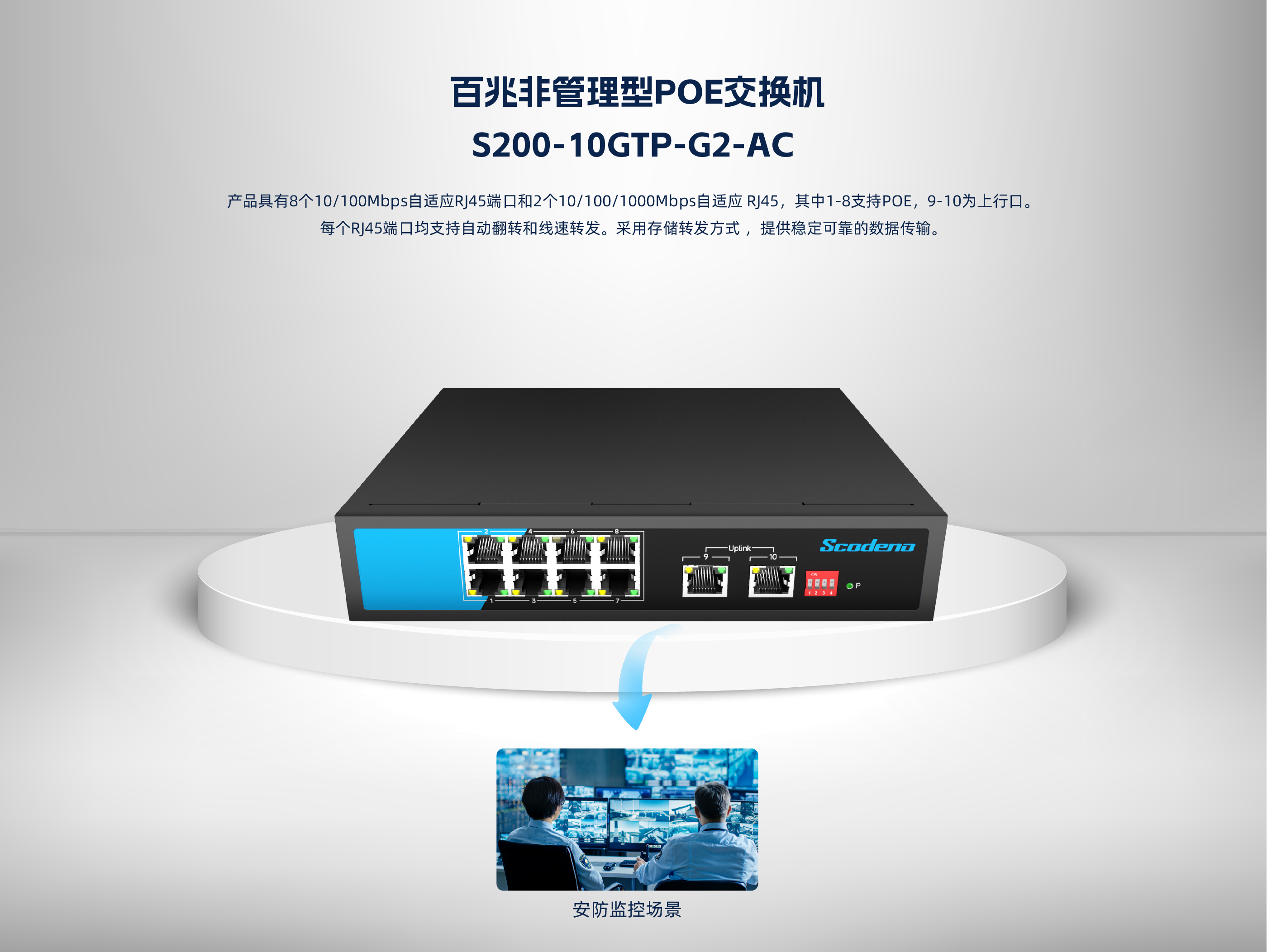 S200-10GTP-G2-AC系列非管理型PoE交换机 ,具有8个10/100Mbps自适应 RJ45 端口和2个10/100/1000Mbps自适应 RJ45 ,其中1-8支持POE ,9-10为上行 口。每个 RJ45 端口均支持自动翻转和线速转发。采用存储转发方式 ,提供稳定可靠 的数据传输。