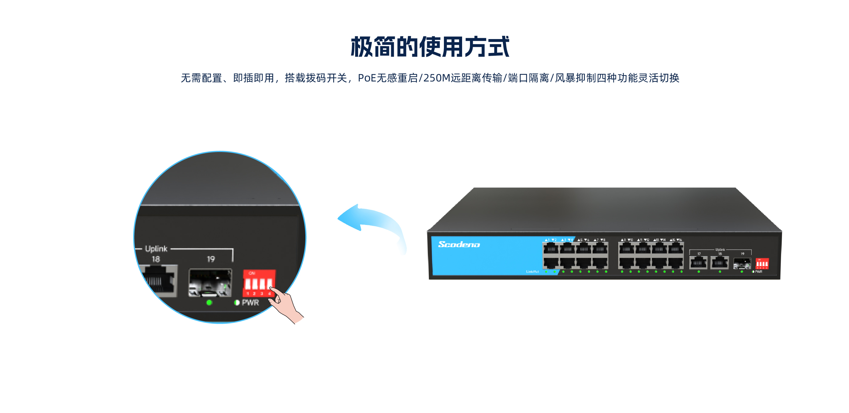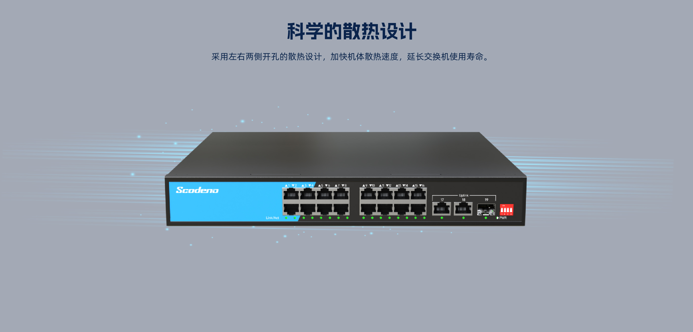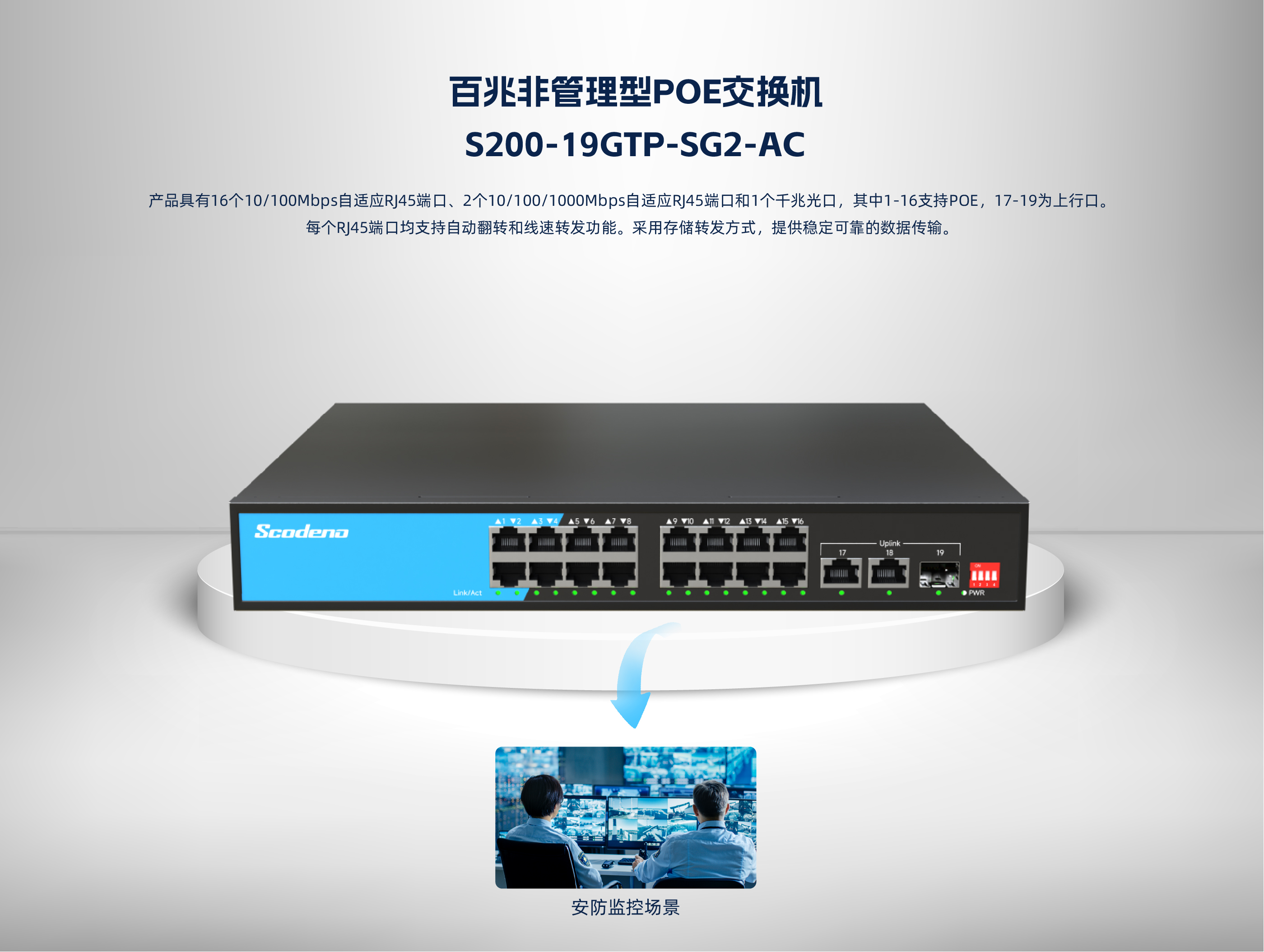 S200-19GTP-SG2-AC系列非管理型PoE交换机 ,具有16个10/100Mbps自适 应 RJ45 端口、2个10/100/1000Mbps自适应 RJ45端口和1个千兆光口 ,其中1-16 支持POE , 17-19为上行口。每个 RJ45 端口均支持自动翻转和线速转发功能。采用 存储转发方式 ,提供稳定可靠的数据传输。