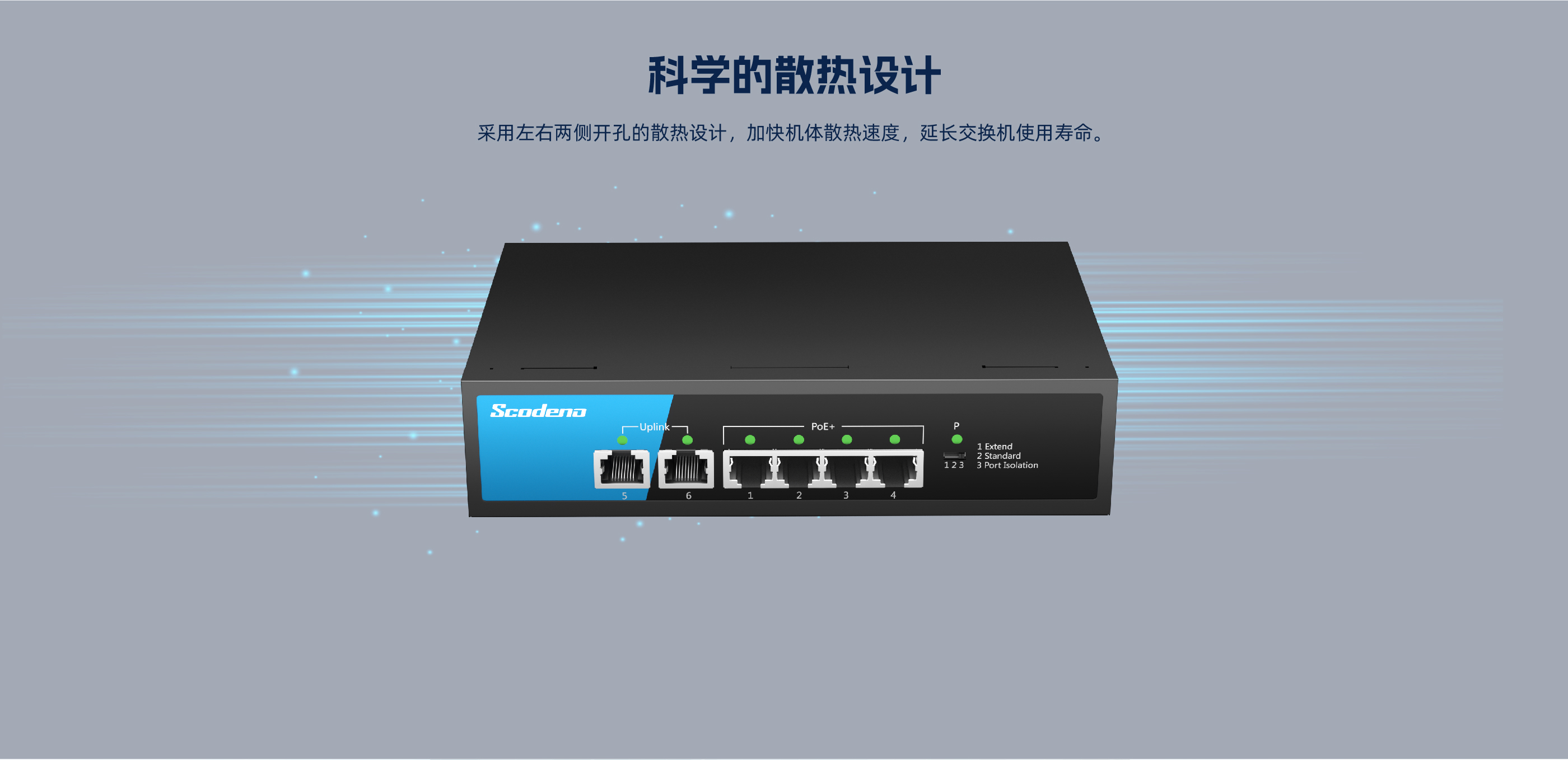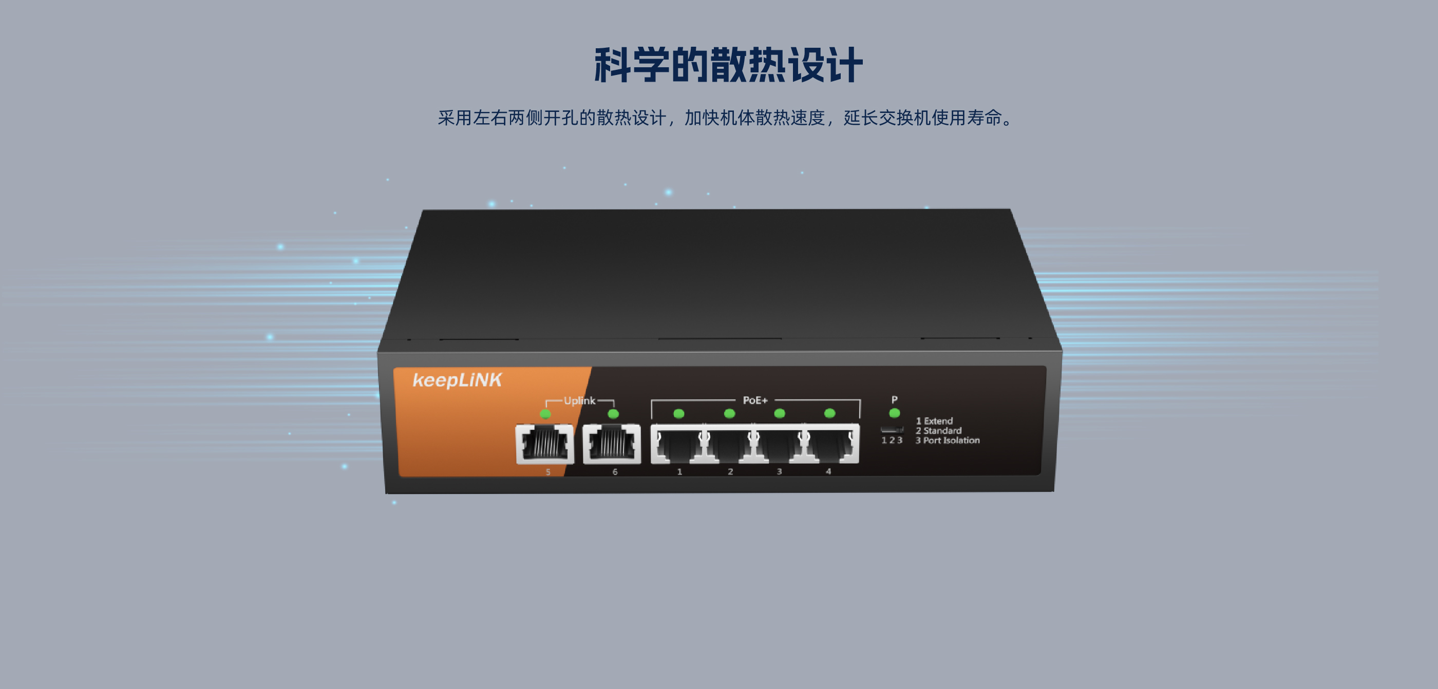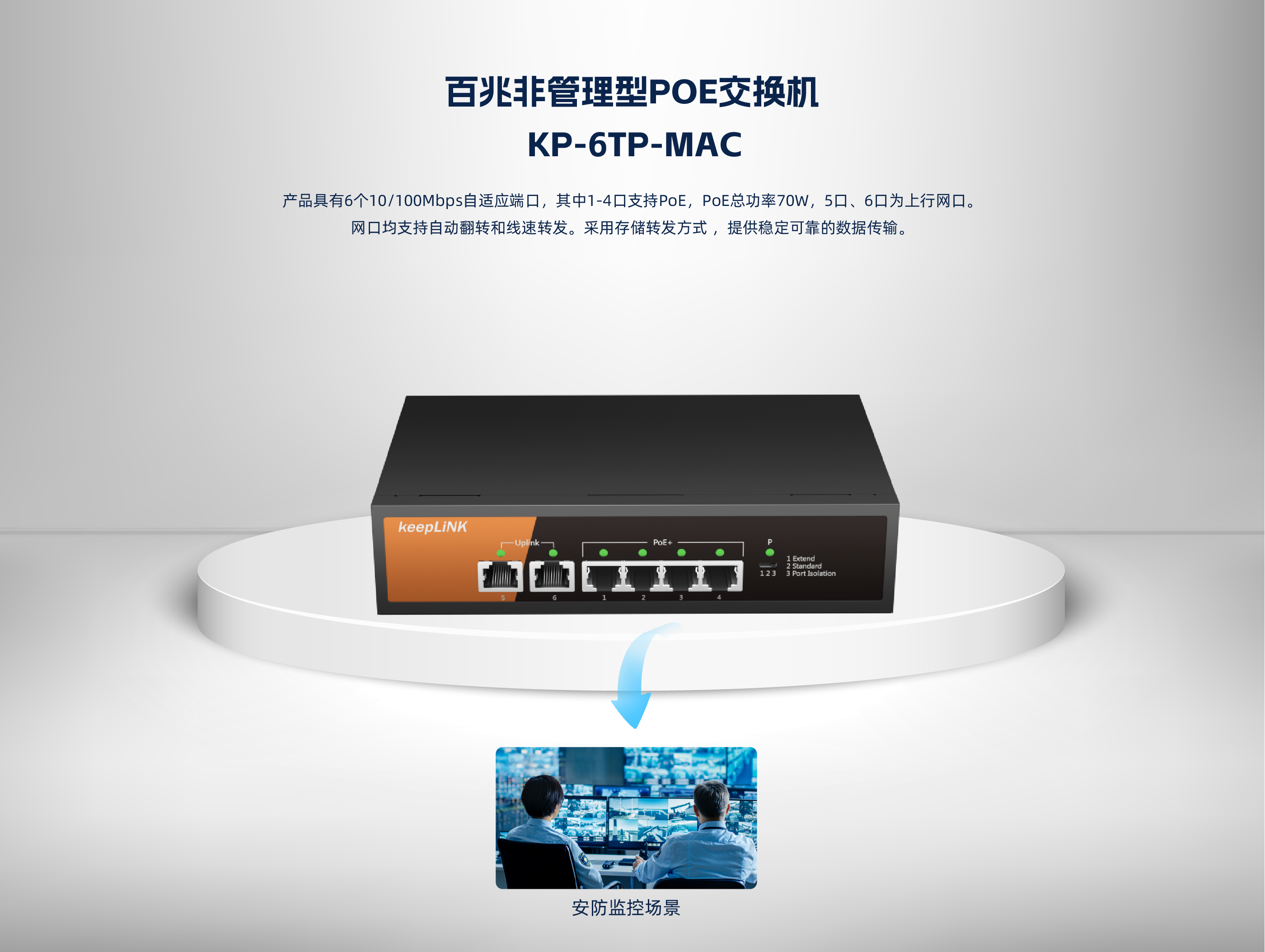 KP-6TP-MAC系列非管理型PoE交换机 ,具有6个10/100Mbps自适应端口 , 其中1-4口支持PoE , PoE总功率70W , 5口、6口为上行网口。网口均支持自动翻转 和线速转发。采用存储转发方式 ,提供稳定可靠的数据传输。
