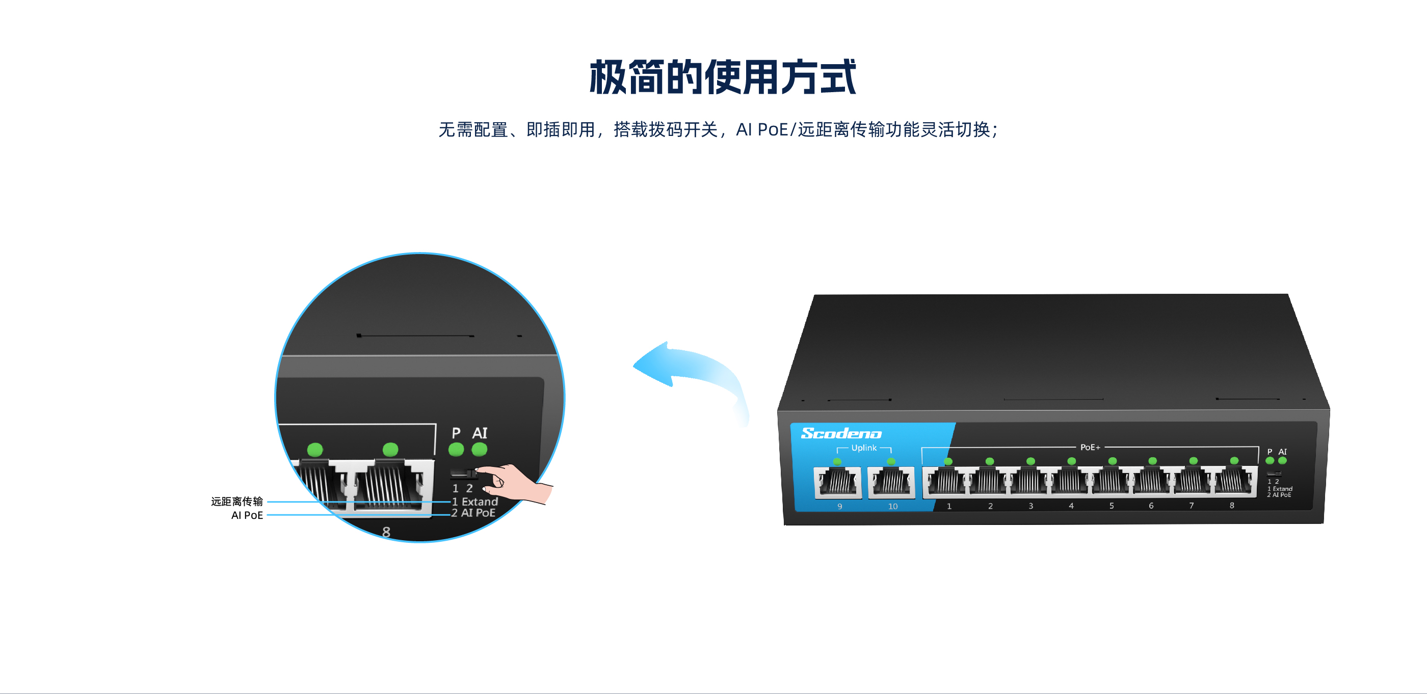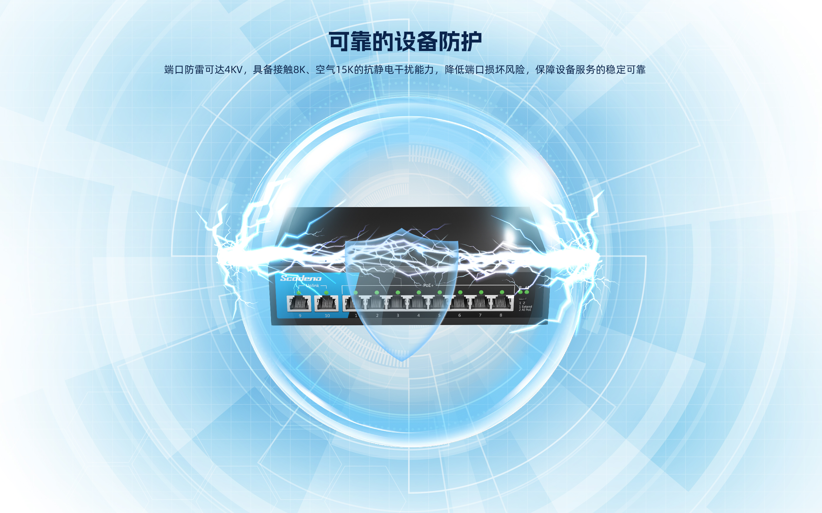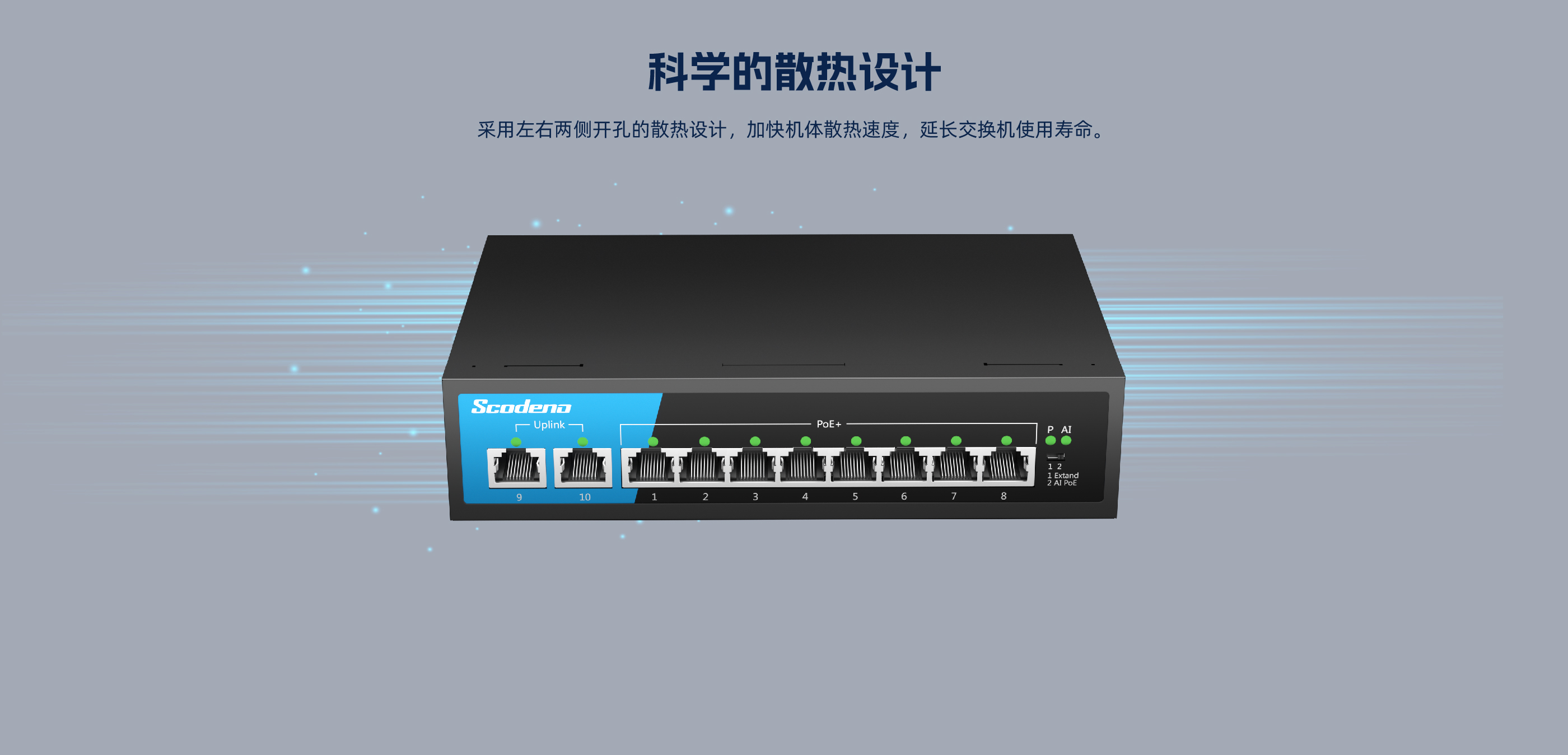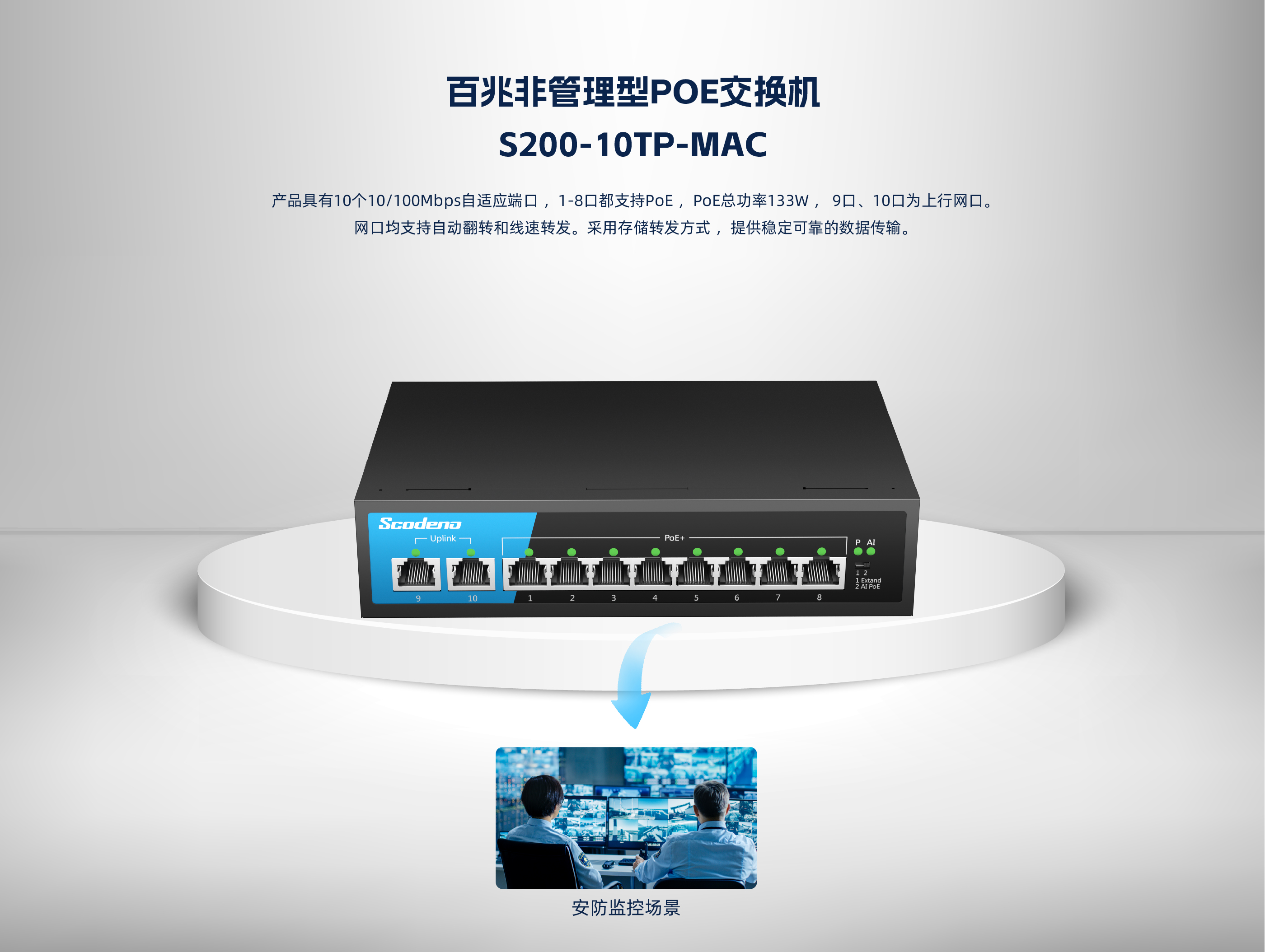 KP-10TP-MAC系列非管理型PoE交换机 ,具有10个10/100Mbps自适应端 口 , 1-8口都支持PoE , PoE总功率133W , 9口、 10口为上行网口。网口均支持自 动翻转和线速转发。采用存储转发方式 ,提供稳定可靠的数据传输。