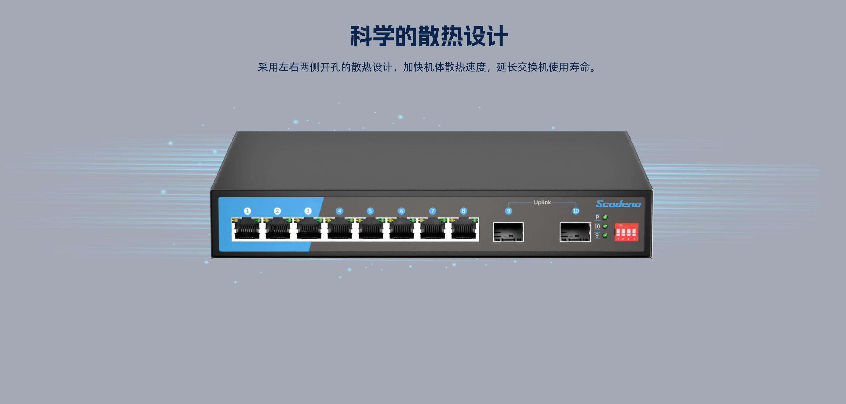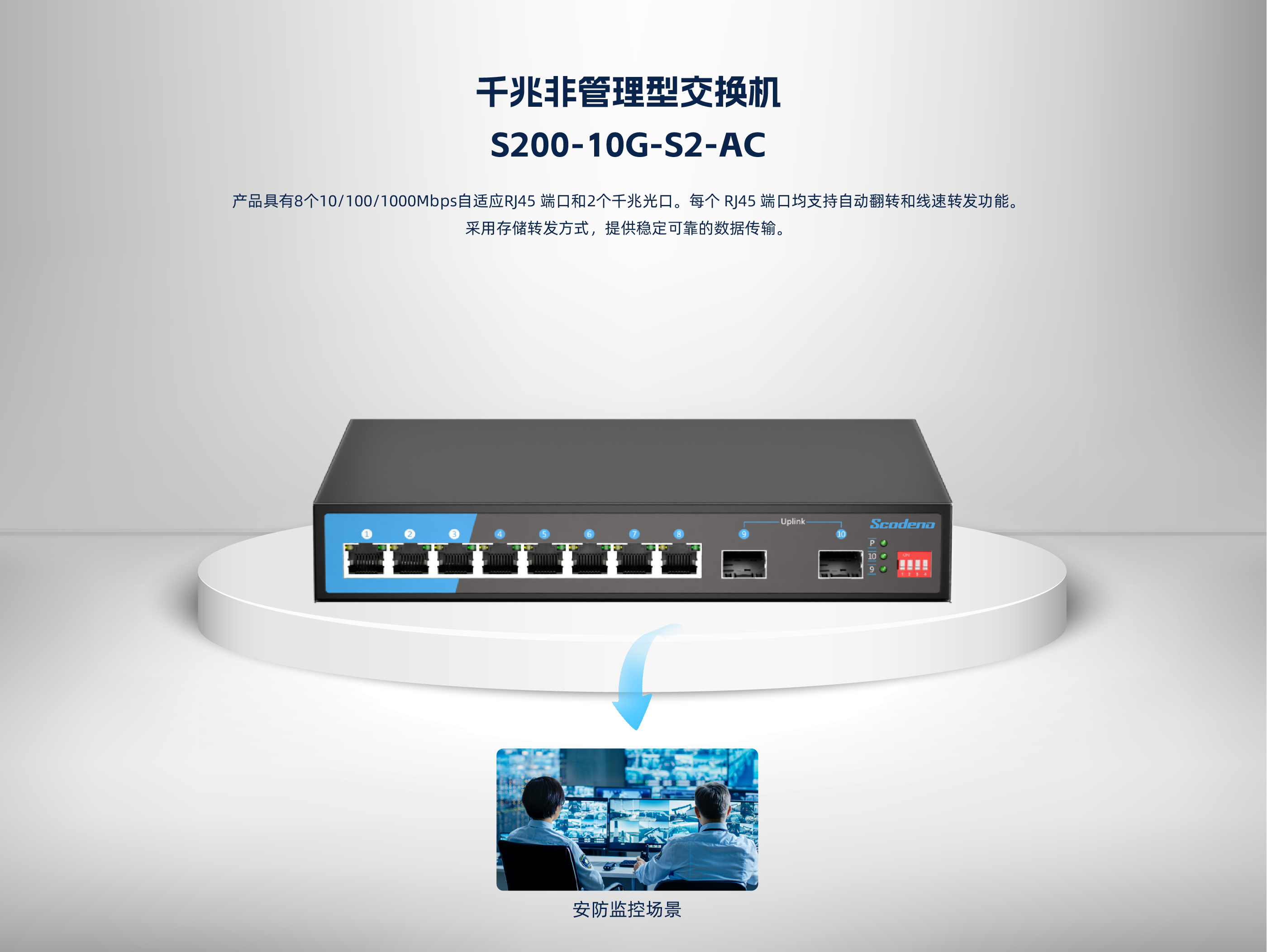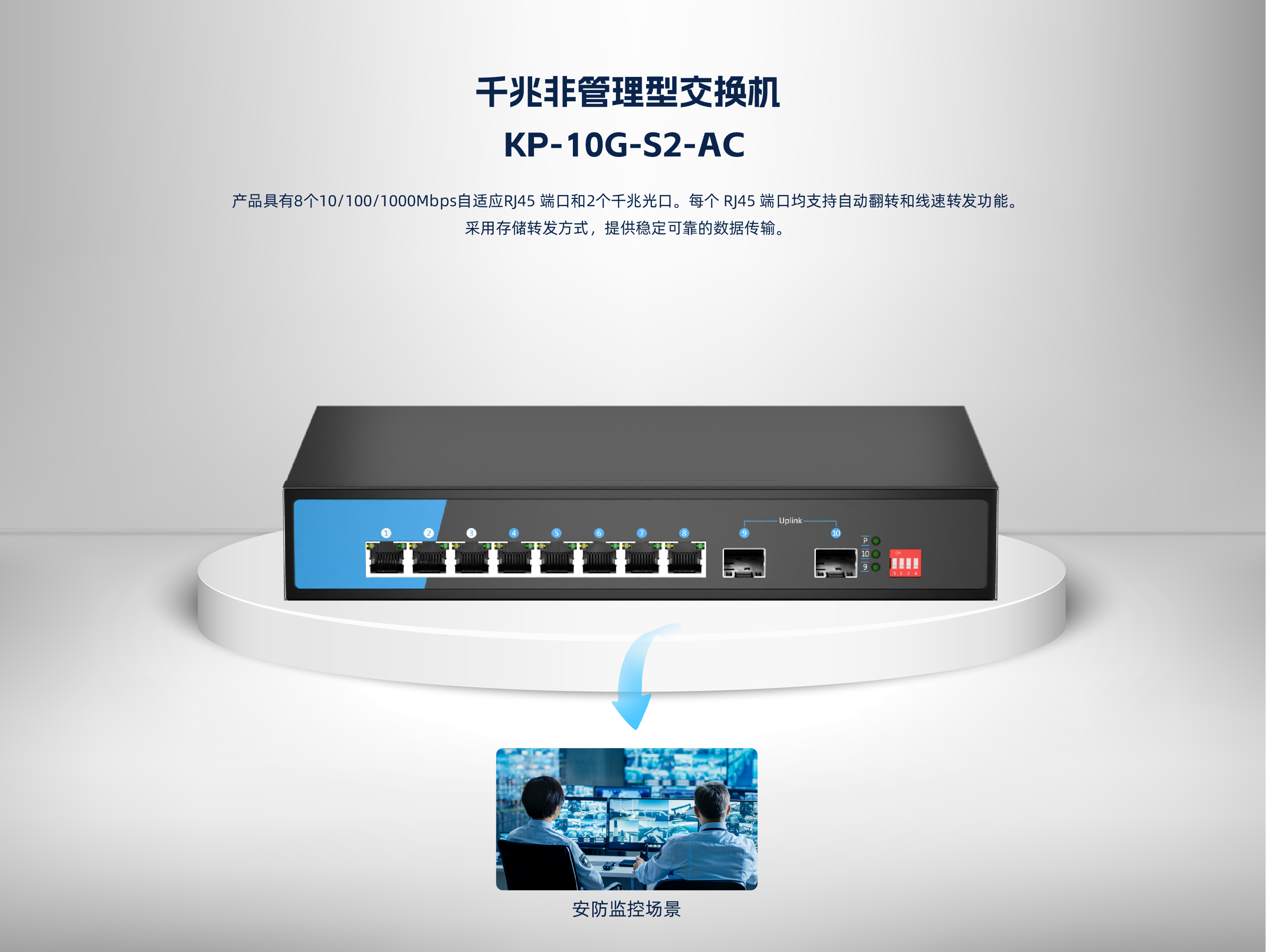 KP-10G-S2-AC系列非管理型交换机 ,具有8个10/100/1000Mbps自适应RJ45 端口和2个千兆光口。每个 RJ45 端口均支持自动翻转和线速转发功能。采用存储 转发方式 ,提供稳定可靠的数据传输。