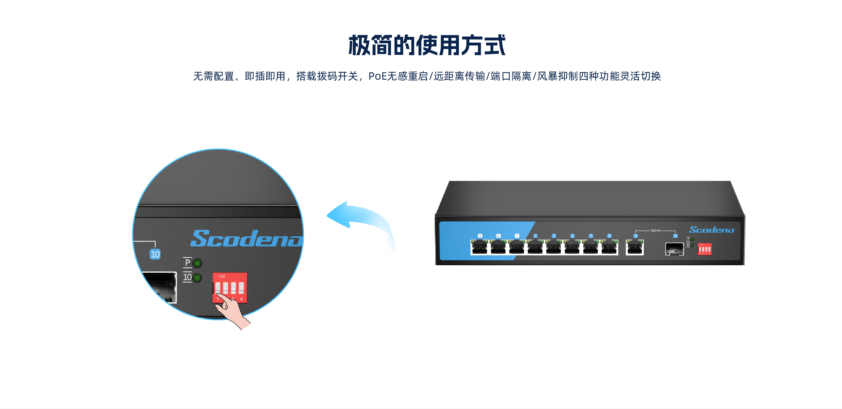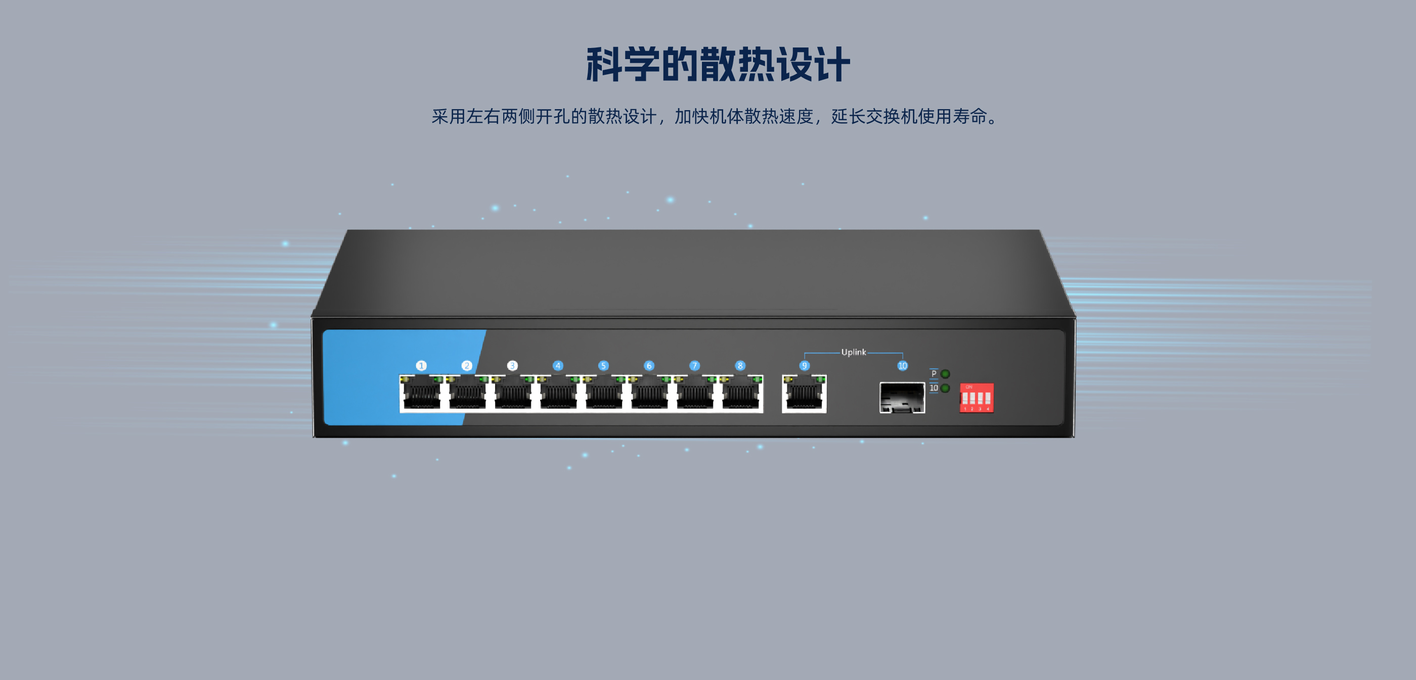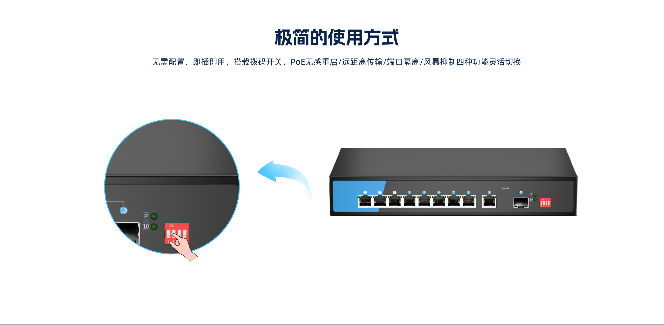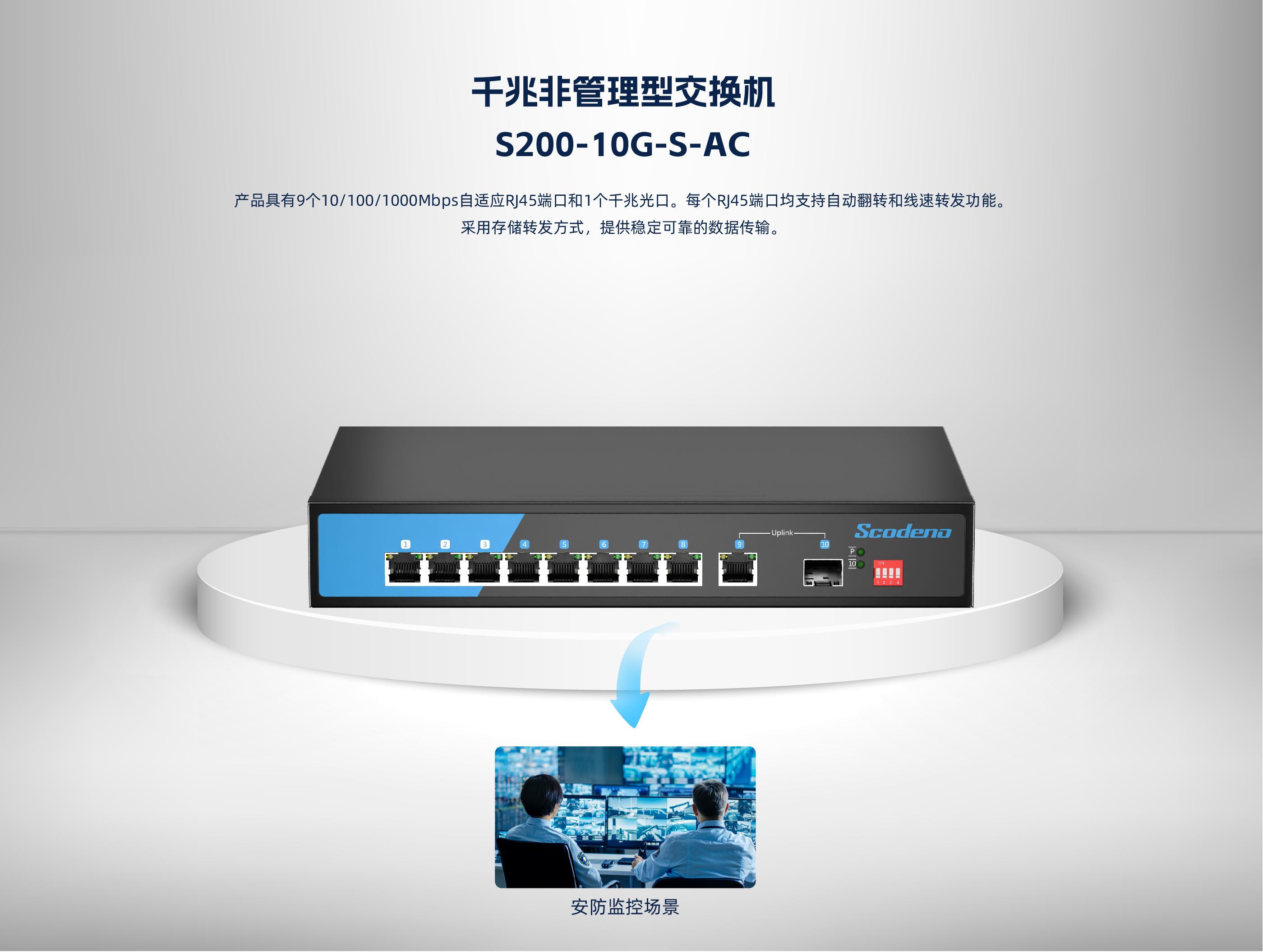S200-10G-S-AC系列非管理型交换机 ,具有9个10/100/1000Mbps自适应RJ45 端口和1个千兆光口。每个 RJ45 端口均支持自动翻转和线速转发功能。采用存储 转发方式 ,提供稳定可靠的数据传输。