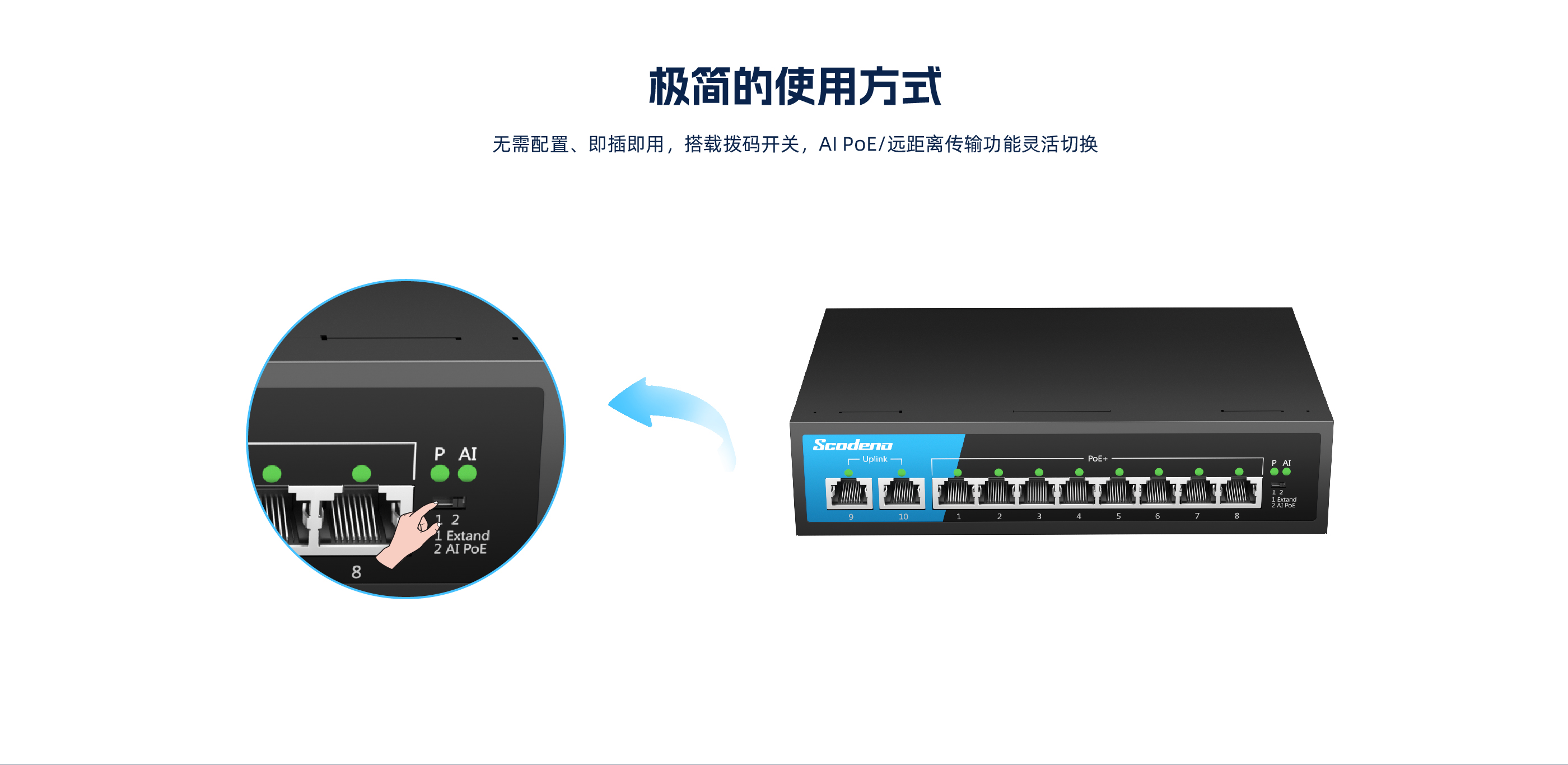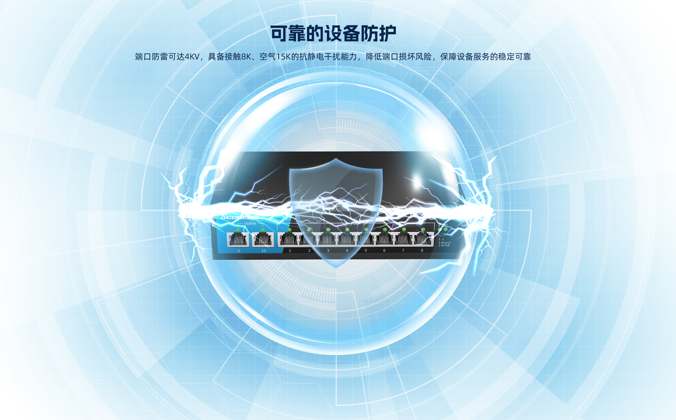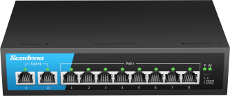 KP-10GP-MAC系列非管理型PoE交换机 ,具有10个10/100/1000Mbps自 适应端口 , 1-8口都支持PoE , PoE总功率120W , 9口、 10口为上行网口。网口均 支持自动翻转和线速转发。采用存储转发方式 ,提供稳定可靠的数据传输。